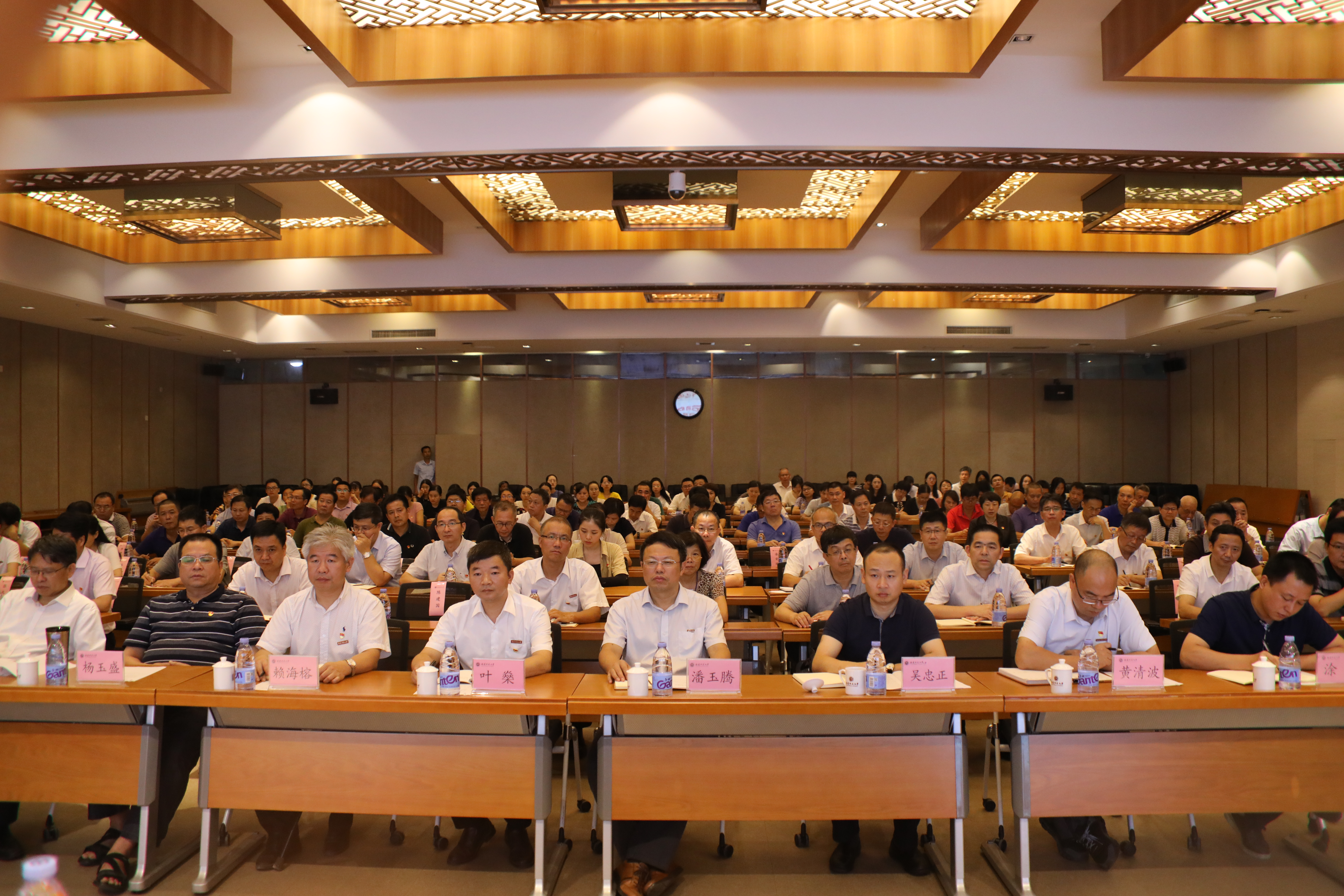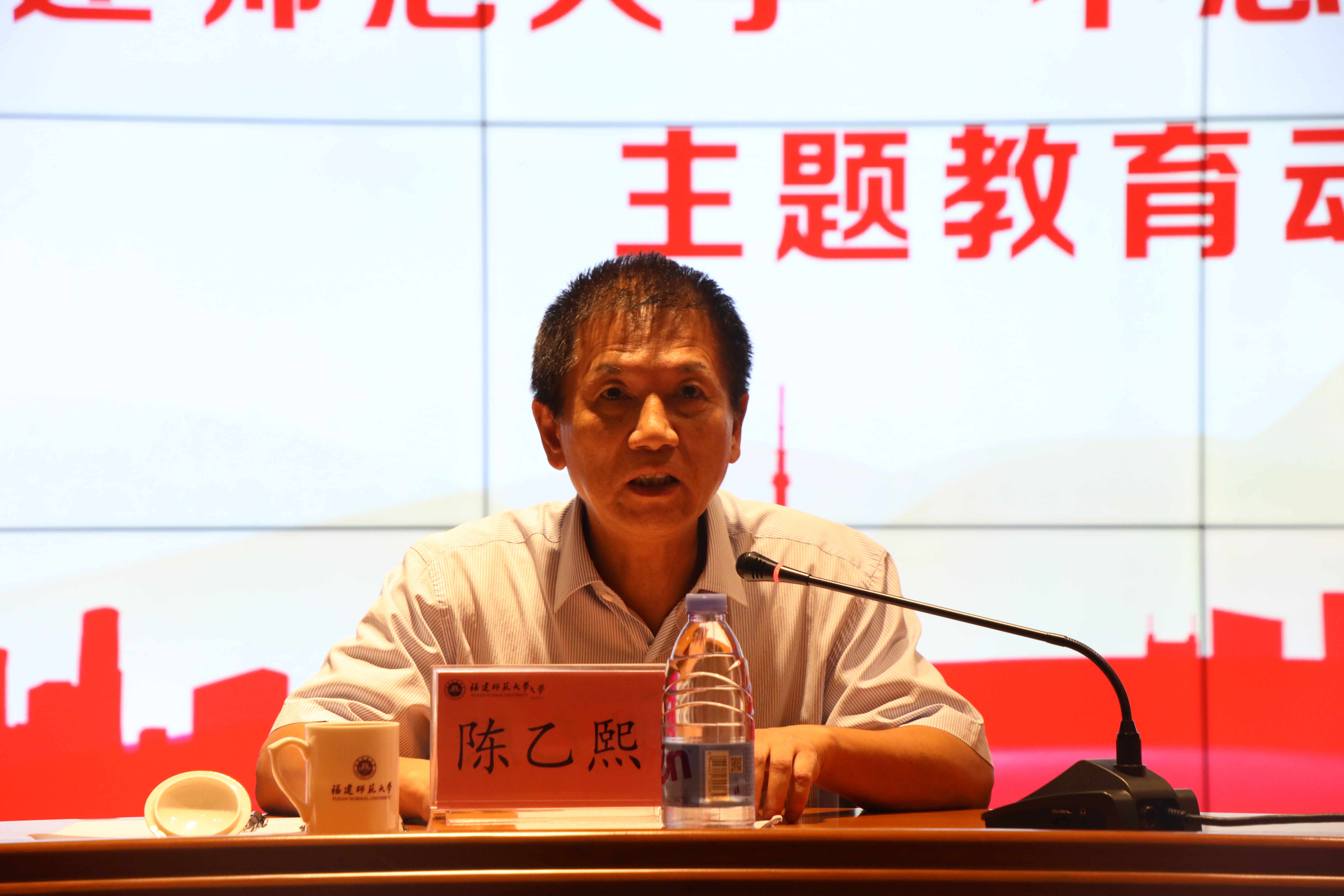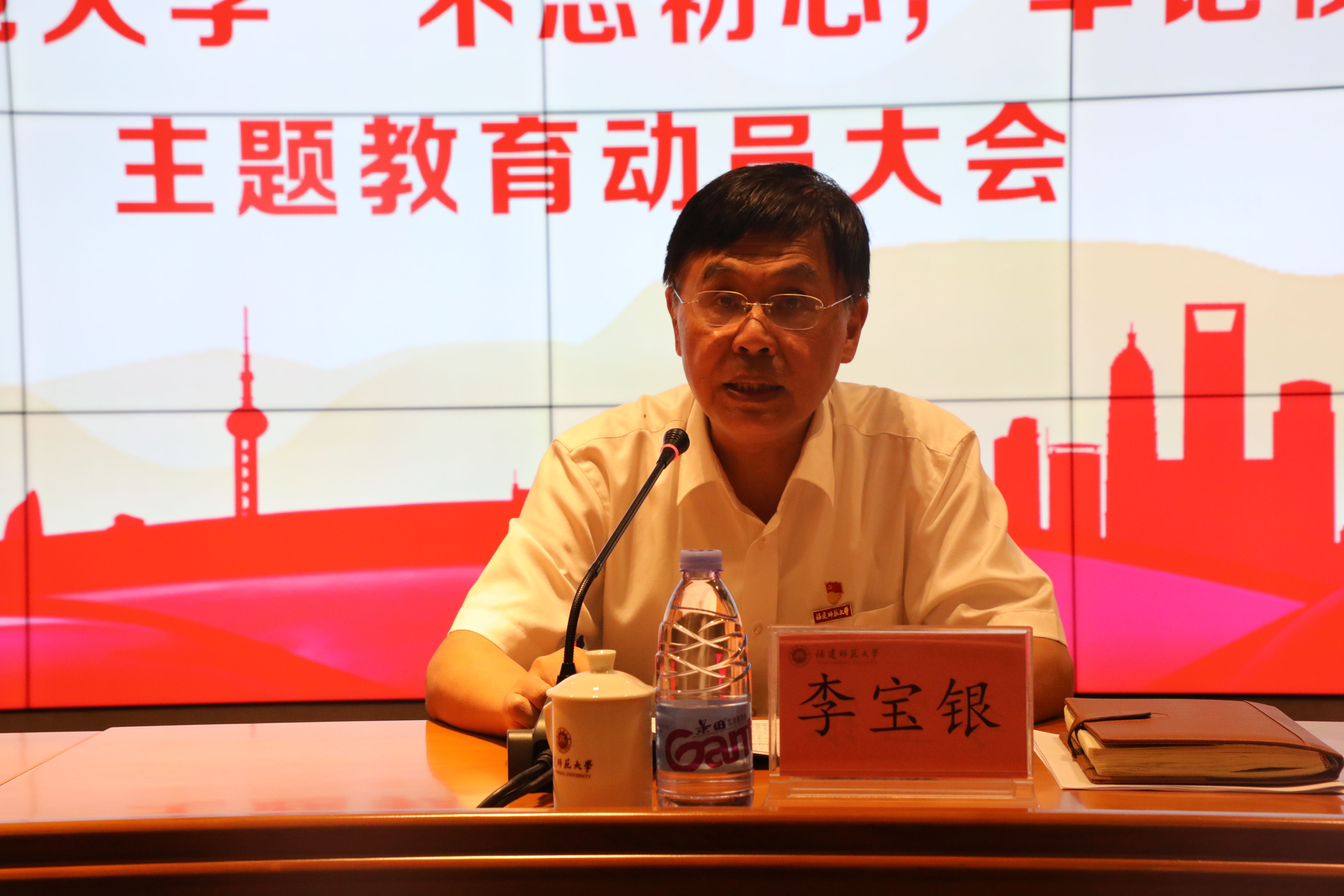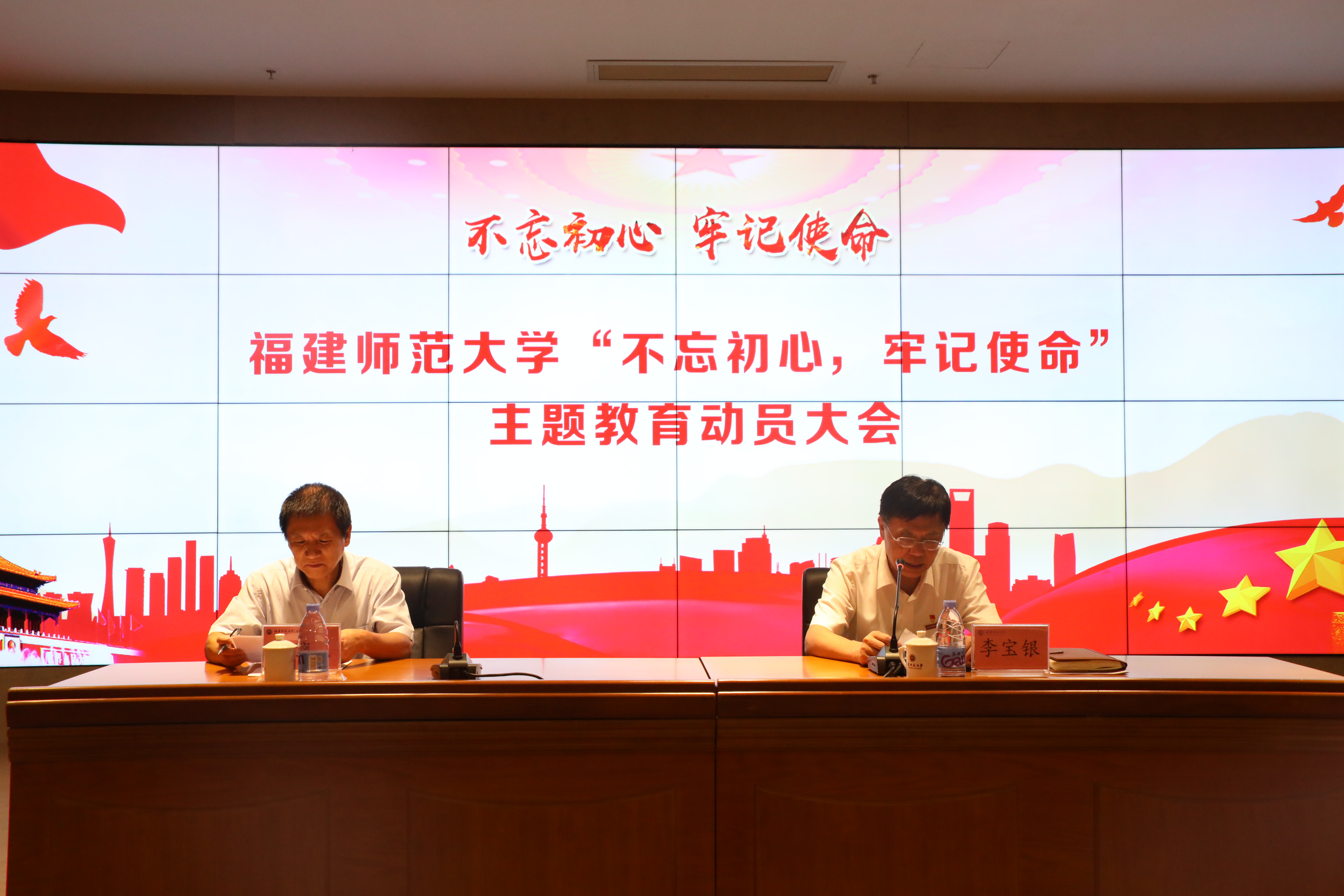 9月12日下午,我校在旗山校区宏达厅召开“不忘初心、牢记使命”主题教育动员大会。省委第十一巡回指导组组长陈乙熙、指导组成员吴忠正,学校党政领导班子成员,机关各部、处、馆、室、中心负责人,各学院、福清分校、闽南科技学院、协和学院、附中、附小党政主要负责人,教授党员代表、教职工党员代表、学生党员代表参加了大会。