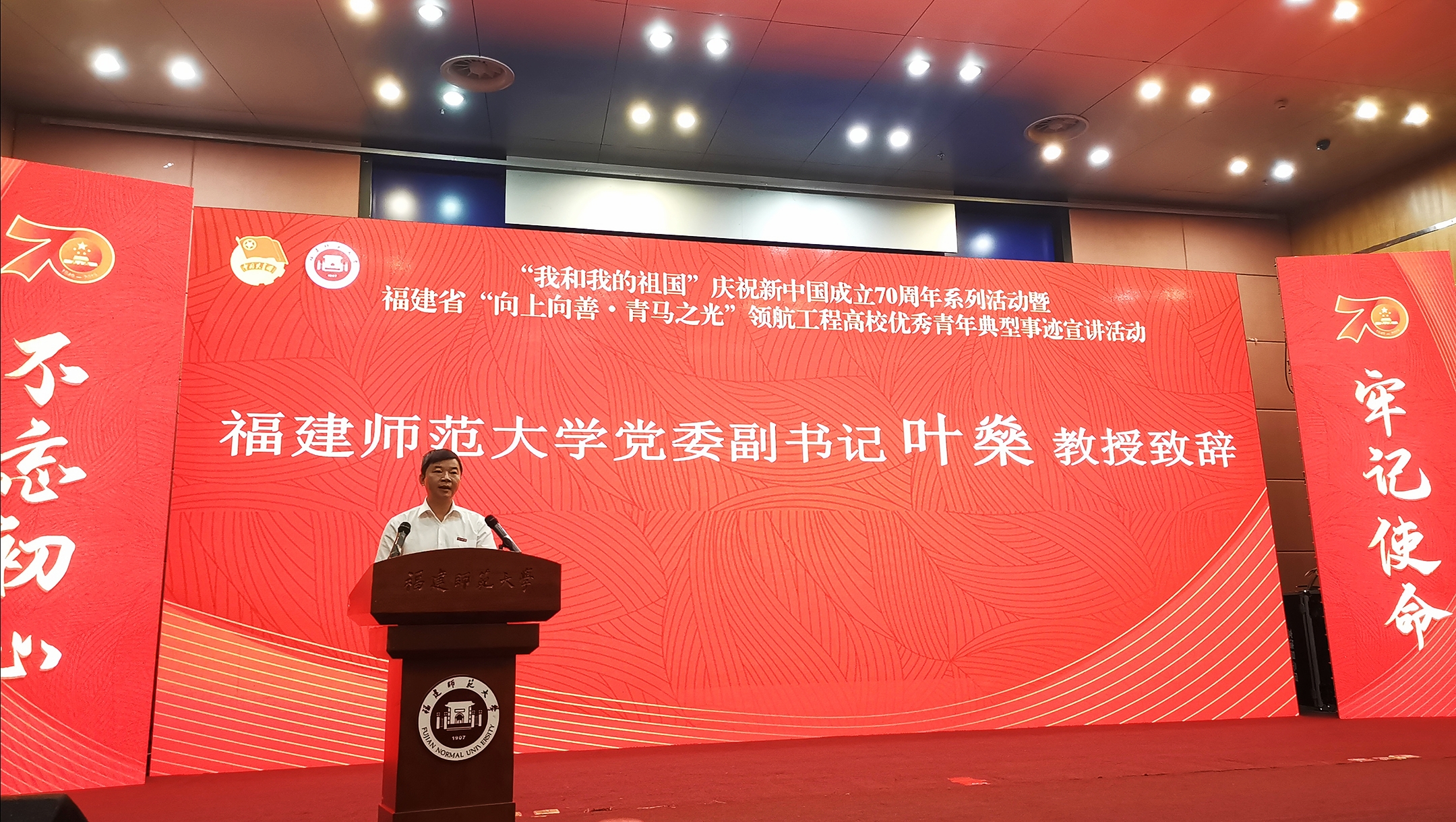 9月22日上午,由共青团福建省委、福建省学生联合会主办,我校团委承办的“我和我的祖国”庆祝新中国成立70周年系列活动暨福建省“向上向善•青马之光”领航工程高校优秀青年典型事迹宣讲活动首场宣讲在旗山校区图书馆学术大讲堂举行。校党委副书记叶燊,团省委、校团委等有关单位负责人,福建省“向上向善”奖教学金获得者代表,我校师生代表400余人参加了活动。