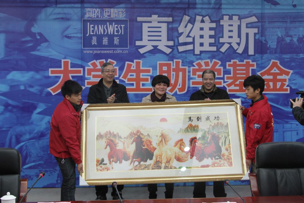 颁发仪式上,真维斯希望工程爱心社向真维斯公司赠送了一幅十字绣作品。受资助学生代表朱芳同学对真维斯服饰有限公司乐善好施、授人以渔的义举表达了深深的谢意,并代表所有受助学生表示:在今后的日子里,把困难当做砥砺自己的磨刀石和鞭策自己的动力,奋发成才,回报社会,将“达则兼济天下”的理念传递给每一位需要帮助的人。