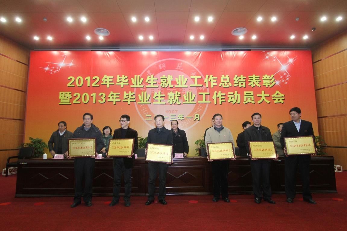会上对2012年本专科毕业生就业率前六名的材料科学与工程学院、传播学院、地理科学学院、外国语学院、人民武装学院、经济学院,对2012年本专科毕业生签约率前六名的法学院、人民武装学院、公共管理学院、社会历史学院、光电与信息工程学院、环境科学与工程学院,对2012年毕业研究生就业率100%的14个学院,对获得2012年就业工作创新奖的地理科学学院、外国语学院,对获得“2011—2012学年毕业生就业工作贡献奖”的冯直康等14位同志,对获得“2011—2012学年毕业生就业工作先进个人”的叶玉仙等31位同志进行了表彰奖励。