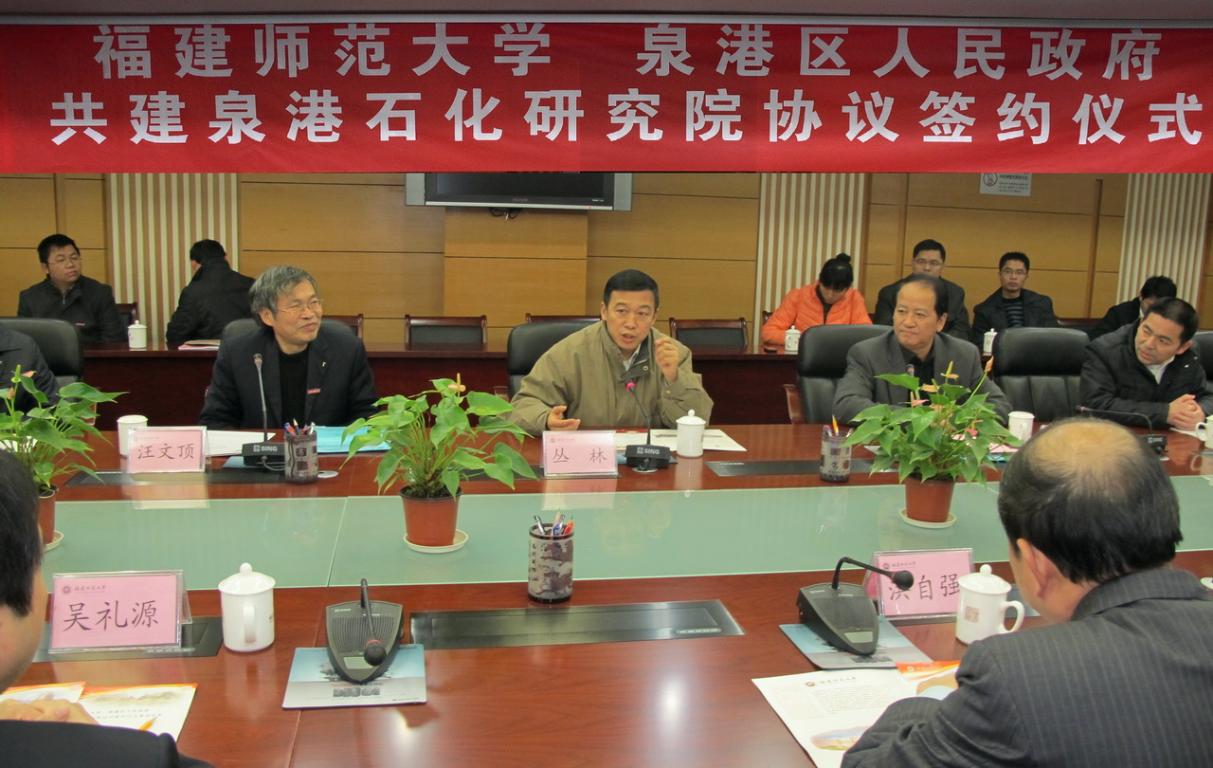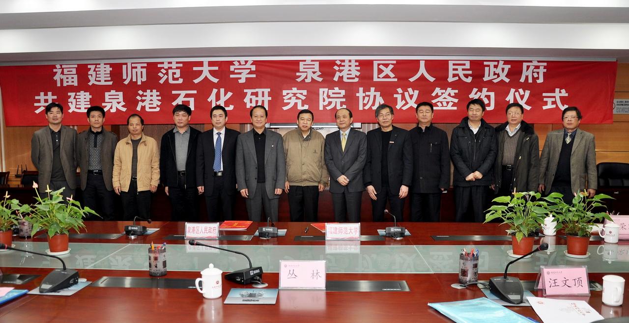仪式于1月11日下午在我校举行。省科技厅厅长丛林、厅办公室主任游建胜,泉港区委书记洪自强、区长吴礼源等领导,我校党委书记罗萤、副校长汪文顶及相关单位负责人出席了仪式。汪文顶、吴礼源分别代表福建师范大学和泉港区人民政府签署了共建“福建师范大学泉港石化研究院”协议。
