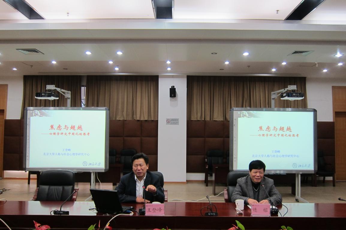 2月22日上午,教育部体卫艺司司长、中国心理学会副理事长、中国社会心理学会副理事长、北京大学--香港青年协会青少年发展研究中心联合主席、北京大学人格与社会心理学研究中心主任、北京大学心理学系博士生导师王登峰教授莅临我校,为教育学院心理学系师生作了题为“焦虑与超越——心理学研究中国化的思考”的学术报告。