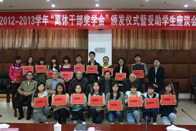 颁发仪式暨受助学生座谈会于3月13日下午在旗山校区第十会议室举行。校关工委主任陈锋,离休干部党总支副书记张卿,陈天寿老师,离退处、学工处负责人和受助学生参加了仪式。