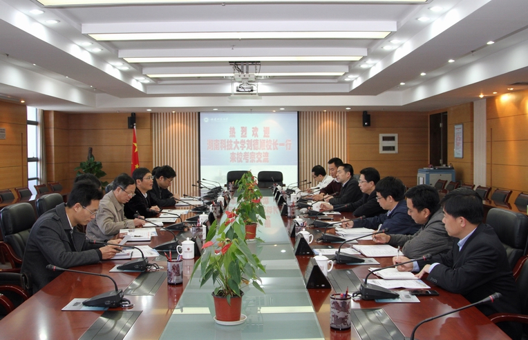 4月7日,湖南科技大学刘德顺校长一行来我校考察交流。校长黄汉升带领相关单位负责同志接待了来宾。 座谈会上,黄汉升代表学校对刘德顺一行的到来表示热烈的欢迎,并简要介绍了学校的发展情况。刘德顺高度评价了我校的办学成就,希望通过加强两校间的交流与合作,促进共同发展。与会人员围绕学校发展战略、干部聘任、机构设置、人事制度改革、学科与专业建设等方面进行了深入的交流与讨论。 刘德顺一行还考察了学校展览馆,并参观旗山校区校园。 (学校办公室 魏建翔)