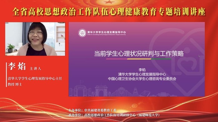 2月3日,由中共福建省委教育工委主办、高校思想政治工作队伍培训研修中心(福建师范大学)承办的全省高校思想政治工作队伍心理健康教育专题培训讲座举办,清华大学学生心理发展指导中心主任,教育部普通高等学校学生心理健康教育专家指导委员会副秘书长,中国心理卫生协会大学生心理咨询专业委员会主任委员、心理咨询师专业委员会副主任委员李焰教授应邀作专题辅导讲座,来自全省各高校高校辅导员、心理健康教育教师共5000余人以线下线上相结合方式参加了活动。