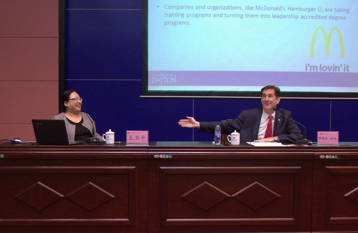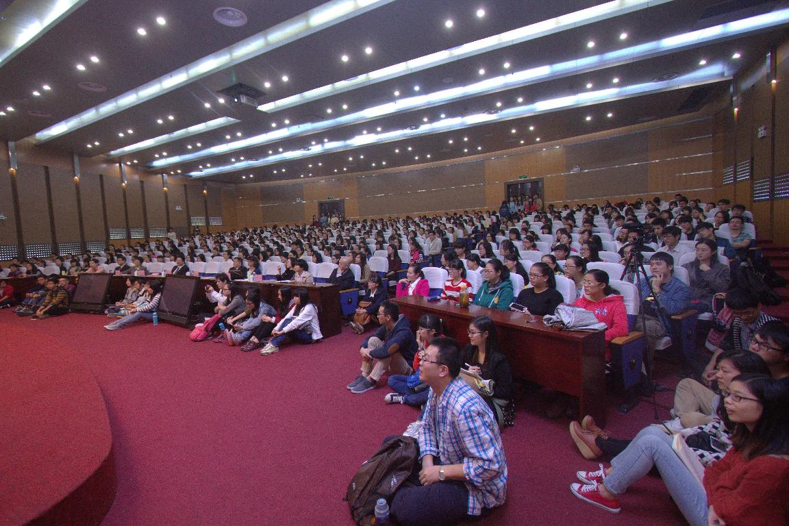 备忘录签订仪式后,丹尼尔·柯伦博士作了题为《美国高等教育制度和美国大学》的报告,这是他到中国50多次以来所作的首场专题报告。他分析了美国高等教育发展新形势,指出高等教育类型多样化、学生需求多元化、学校办学成本效益化,促使美国大学加强校际合作;美国大学强调通识教育,大量国际学生不断涌入,促使美国大学加快课程国际化。柯伦博士还借助视频简要介绍了代顿大学的基本情况,表达了与我校加强沟通、开展两校交流合作的意愿。报告会吸引了我校众多学生参加,整个会场座无虚席,许多学生因找不到座位站着或坐在地上听报告,会场气氛热烈、秩序井然。在互动环节中,柯伦博士与我校学生就美国通识教育、大学排名、代顿大学与我校合作等问题进行了深入交流。柯伦博士表示,从我校学生所提的问题和会场的表现,可以看出我校办学规范、学风优良、学生素质良好。