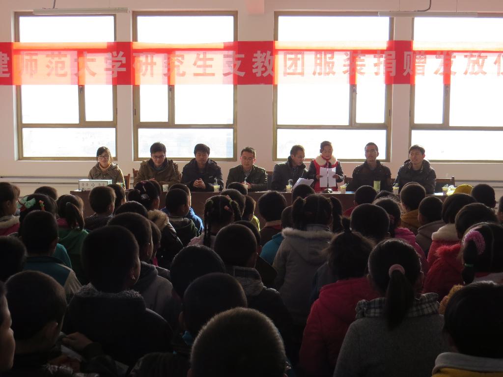 近日,我校“西部爱心助学计划”之“温暖一冬”爱心公益物资发放启动仪式,在甘肃省漳县福建师范大学支教团希望小学举行。漳县团县委负责人、我校第十三届研究生支教团成员、希望小学全体师生参与活动。启动仪式上,支教团成员向小学生发放了棉鞋、手套、围巾、帽子、棉袜等御寒物品近100套,颁发了“西部支教团爱心助学金”,总计人民币1万余元,并鼓励同学们发奋学习,健康成长。
