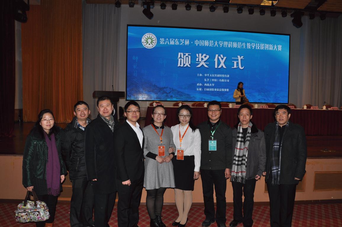 1月11日至12日,由教育部主办的全国师范生最高规格教学技能大赛——第六届“东芝杯•中国师范大学理科师范生教学技能创新大赛”在重庆西南大学举行。本届大赛有来自北京师范大学等全国41所师范大学参加,各校派出数学、物理、化学等专业共122名优秀师范生参赛,每学科只取前10名分获一二三等奖。经过2天的激烈比赛,我校物理学科郑荣炜同学获三等奖(指导老师:黄树清、王素云、林钦;顾问:章镇),数学学科刘诗雨同学(指导老师:董涛)、化学学科赵佳星同学(指导老师:胡志刚、陈燕)获优秀奖。