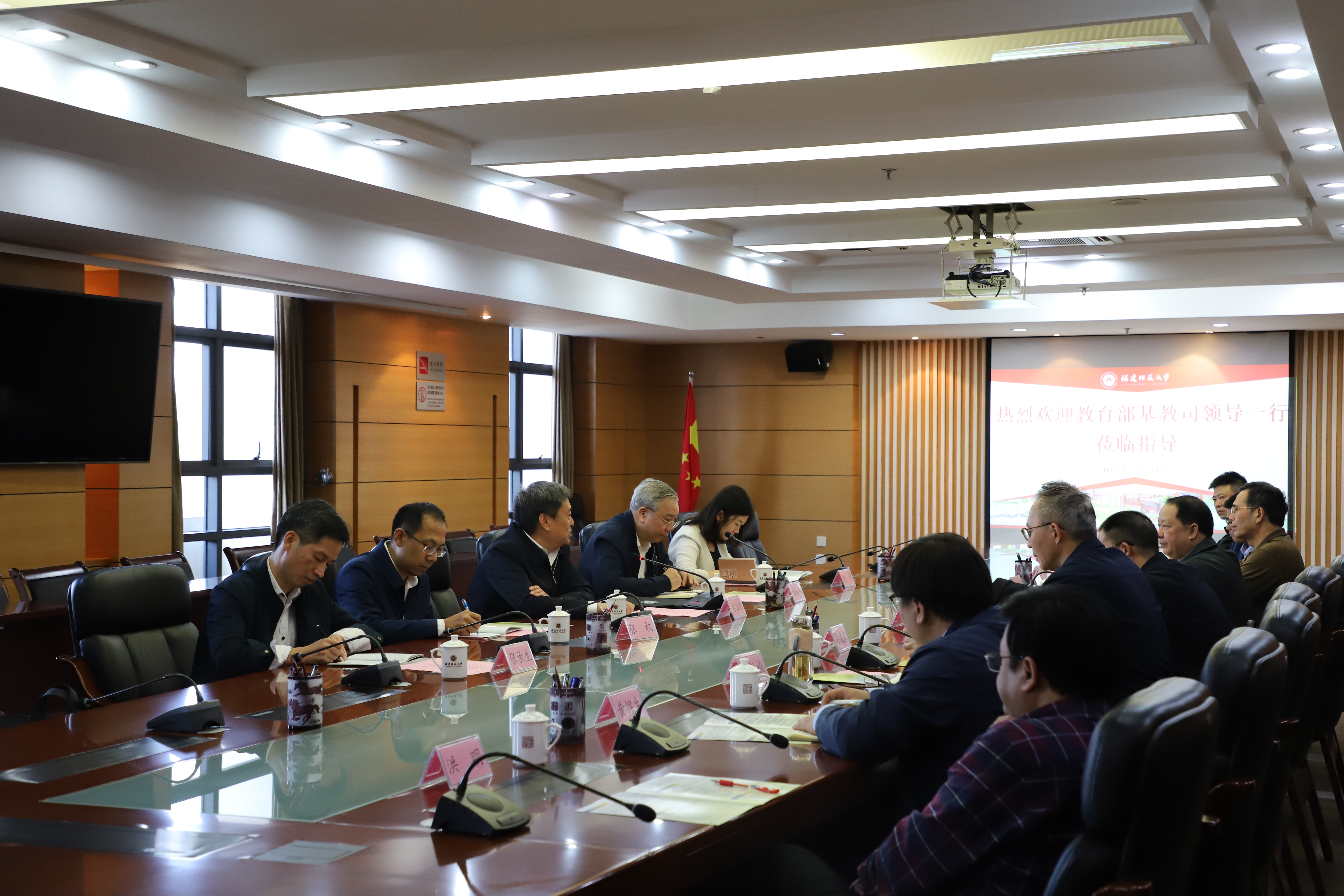 11月21日下午,教育部基础教育司司长吕玉刚、装备与信息化处处长张权、普通高中教育处副处长赵宇,省教育厅厅长林和平、基础教育处副处长张承生等一行到我校调研指导工作,副校长郑家建陪同调研,我校教育学部、基础教育工作委员会办公室、教务处负责人,基础教育课程研究中心、学科教材教法教师代表参加了调研座谈会。
