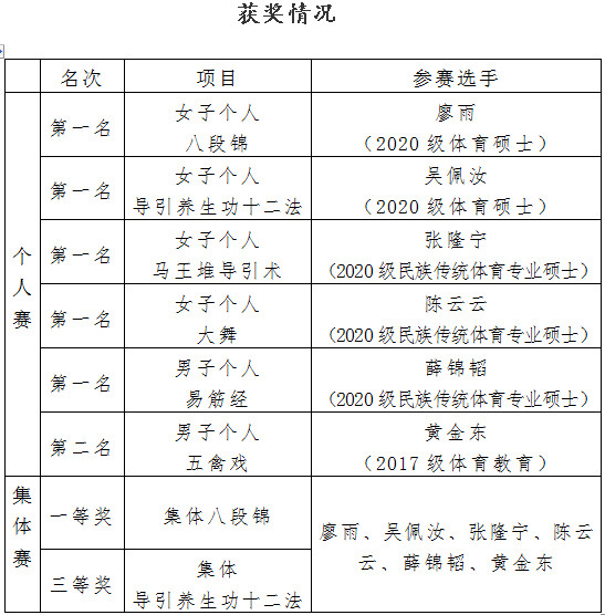 近日,2021年“永远跟党走”福建省大学生健身气功锦标赛在三明沙县体育馆举行。体育科学学院选派的6名运动员参加了乙组(专业组)的比赛,获得个人赛5项第一、1项第二,团体总分第一的好成绩。