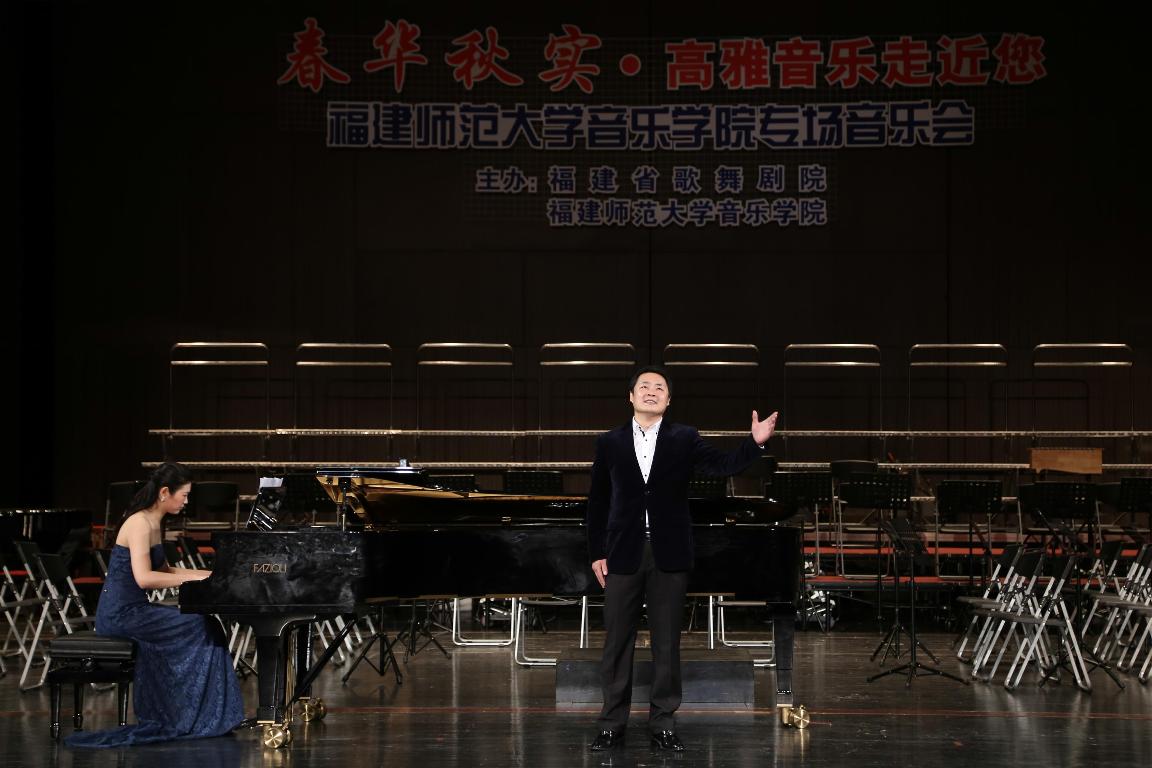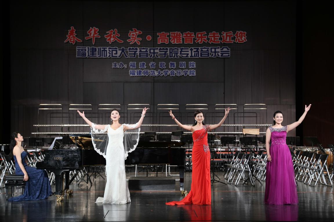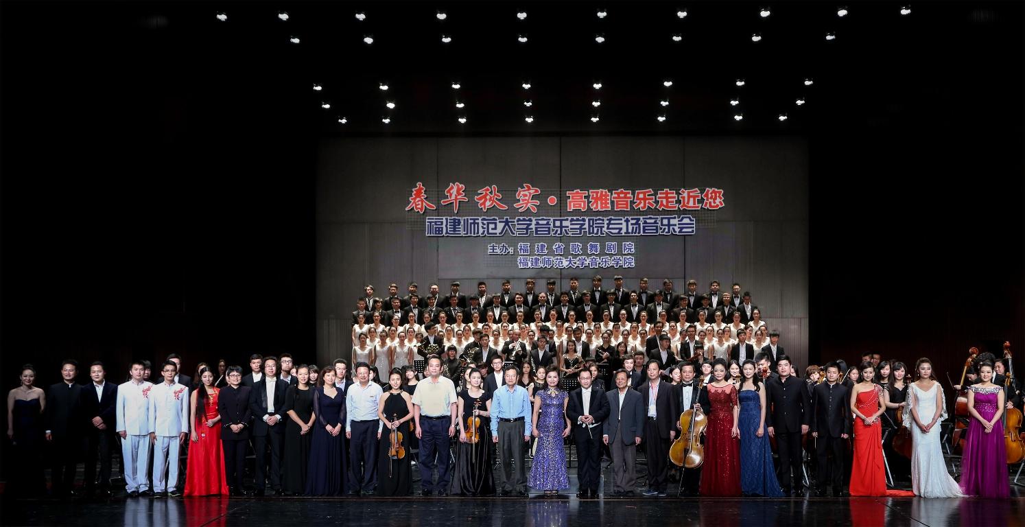 这场大型音乐会是我校音乐学院应福建省歌舞剧院邀请而举办的面向社会各界人士的公益演出,弘扬主旋律、传播正能量。全院师生共三百余人参与了演出。音乐会在民族管弦乐《庆典序曲》中拉开序幕,以交响音乐史诗《黄河大合唱》结束。刚刚获得全国第四届大学生艺术展演声乐类一等奖的合唱曲目《美丽的夏牧场》、《斗牛士进行曲》也精彩亮相。此外,音乐会还演出了小提琴独奏曲《流浪者之歌》、女生三重唱《天路》、男高音独唱《大江南》、钢琴独奏《前奏曲》、弦乐四重奏《美国》等历经时代考验的中西经典音乐作品,体现了“高雅的艺术性”和“审美的通俗性”的有机结合。音乐会获得了现场观众的强烈反响和高度评价。