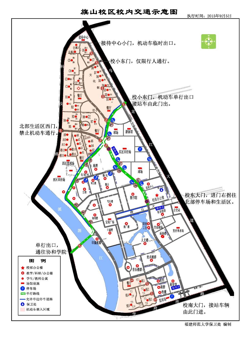 (三)小东门(明德路),星槎桥门,仓山大道北段,明德路,溪源路北段实行单向通行,北部生活区西门禁止机动车通行,请严格按交通示意图行驶,严禁逆向行驶。