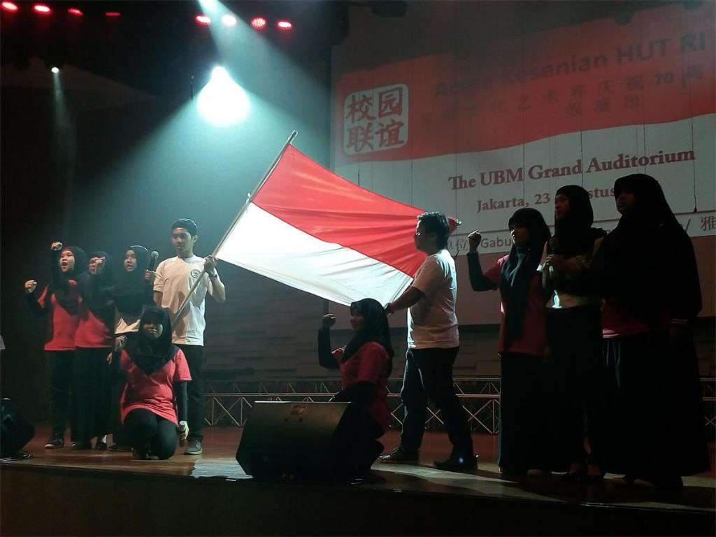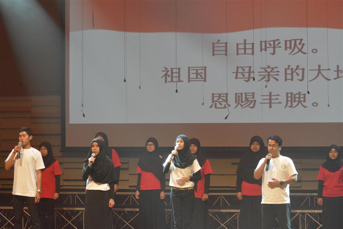 本次印尼首都文化艺术界庆祝建国70周年文艺演出由雅加达校园联谊组织举办。据悉,自2003年以来,雅加达校园联谊组织每年在印尼国庆节期间都举办文艺演出,联合各文化艺术团体,高等院校学生、中小学生以及艺术家们一同欢庆节日,至今已达12年。我校阿拉扎大学孔子学院合唱团曾多次参加演出。此次以朗诵的形式参演,很好地展示了孔院学生汉语学习的成果。