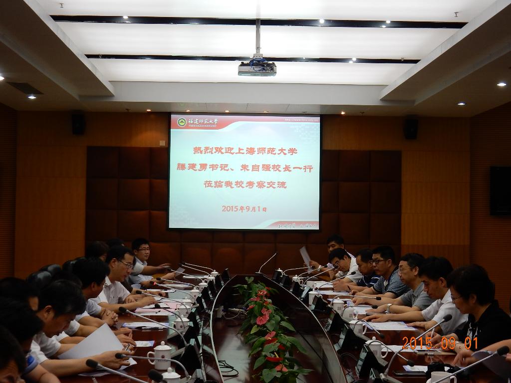 座谈会上,王长平校长代表学校对滕建勇书记、朱自强校长一行表示热烈的欢迎,向考察团简要介绍了学校的基本情况,并希望以此次考察团的来访为契机,加强两校之间的交流与合作,也希望上海师范大学的同仁不吝赐教,对我校建设与发展提出宝贵意见和建议。随后,双方与会人员围绕“十三五”事业发展规划、内部冶理、学科建设、人才培养、科学研究与社会服务以及人才队伍建设等方面展开交流讨论。