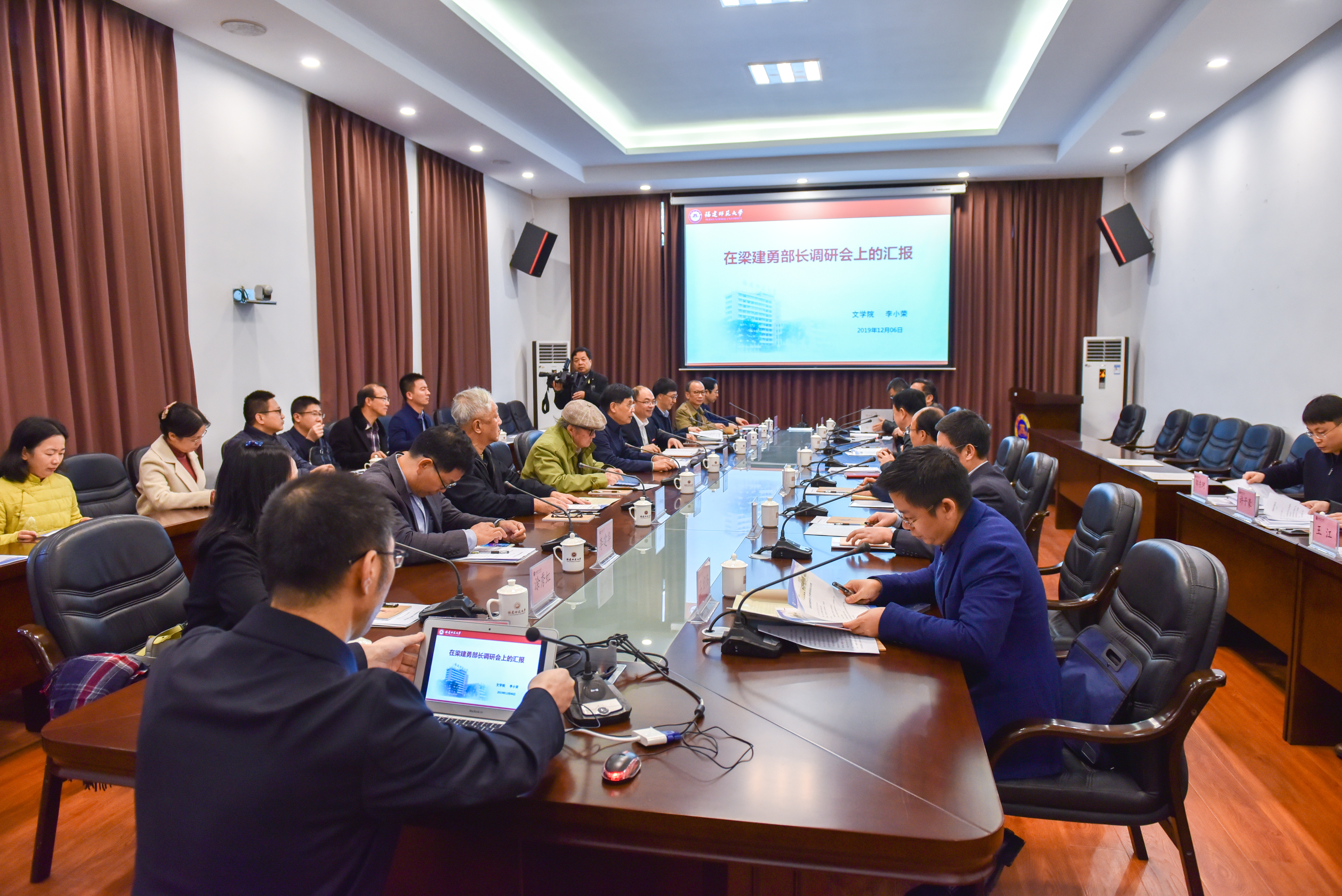 文学院院长李小荣汇报了建阳刻本研究、《大美福建》外宣读本工作情况,涂秀虹教授作补充汇报;传播学院院长谢宗贵汇报了部校共建和福建省电影剧本创作研究中心有关情况;文学院孙绍振教授、传播学院颜纯钧教授分别在座谈会上发言。