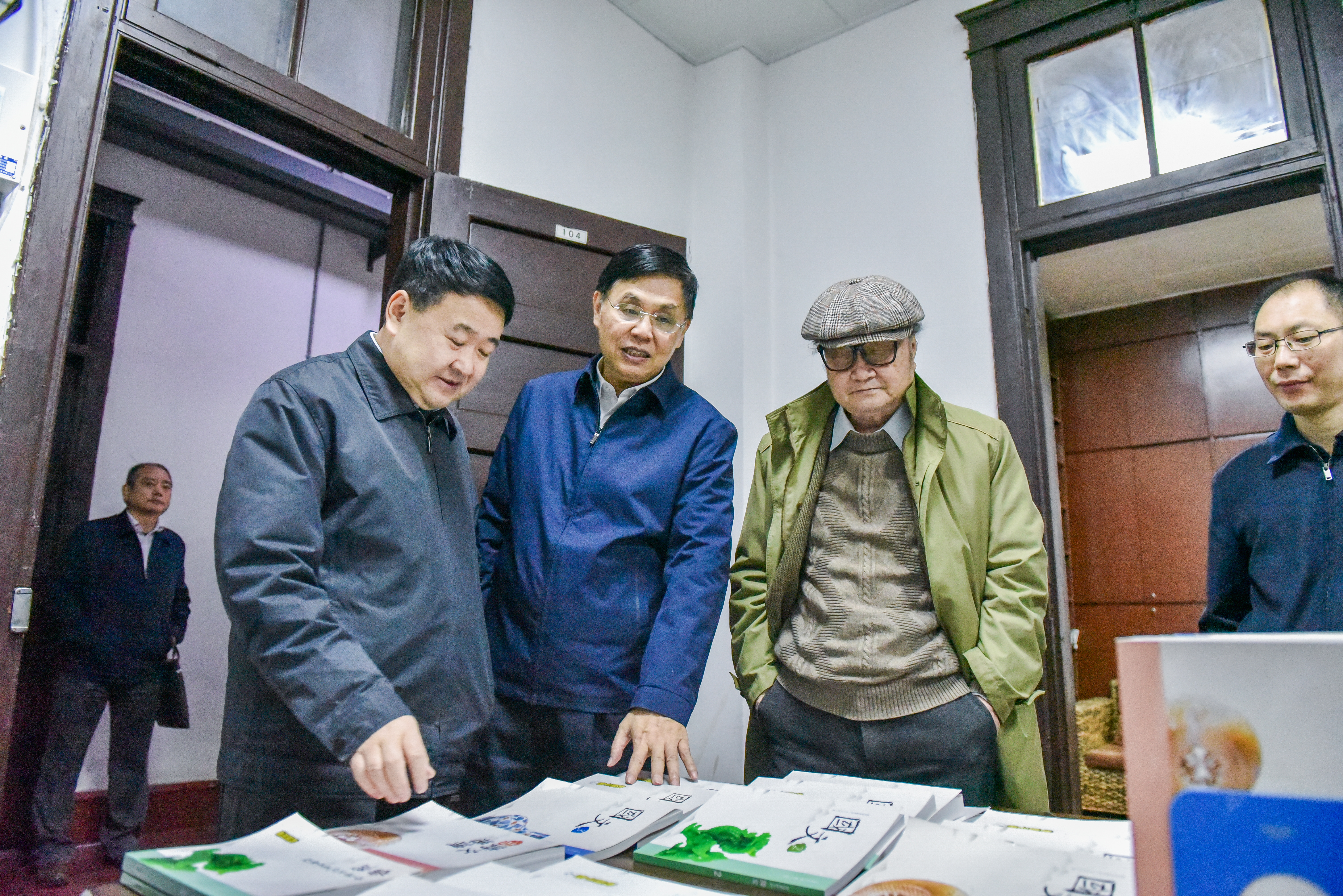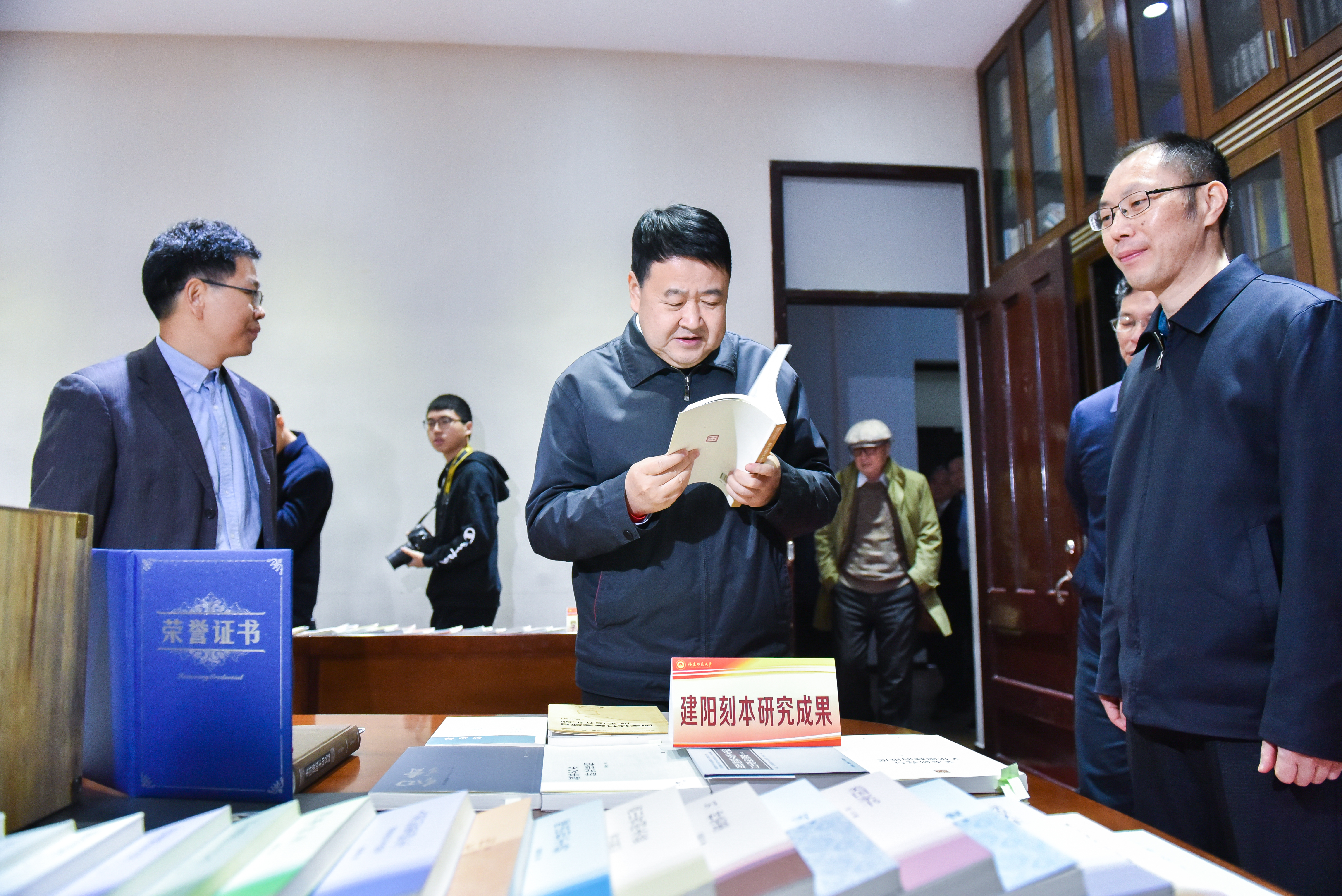 在传播学院,梁建勇等领导共同为福建省电影剧本创作研究中心授牌、为福建师范大学融媒体应用研发中心和全景演播实验室揭牌,考察了星雨剧场等教学场所。在文学院,梁建勇一行走访了原华南女子文理学院办学旧址,看望了文学院孙绍振教授,观看了两岸合编高中语文教材中心,了解了文学院入台出版工程及文学创作出版工程成果、建阳刻本研究成果、闽台区域研究中心成果等。