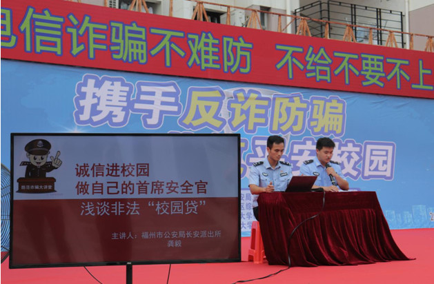 近日,由福州市公安局上街(高新区)分局、福州高新区综治信访中心、校保卫处(武装部)和我校法学院联合举办的“携手反诈防骗,共筑平安校园”主题活动在我校旗山校区共青团广场举行。我校保卫处(武装部)副处长戴文坤、法学院党委副书记周延锋、福州市公安局上街(高新区)分局长安派出所教导员吴正栋、福州市公安局上街(高新区)分局长安派出所副所长叶军,福州高新区综治信访中心等有关单位代表及学校师生200余人参加了活动。