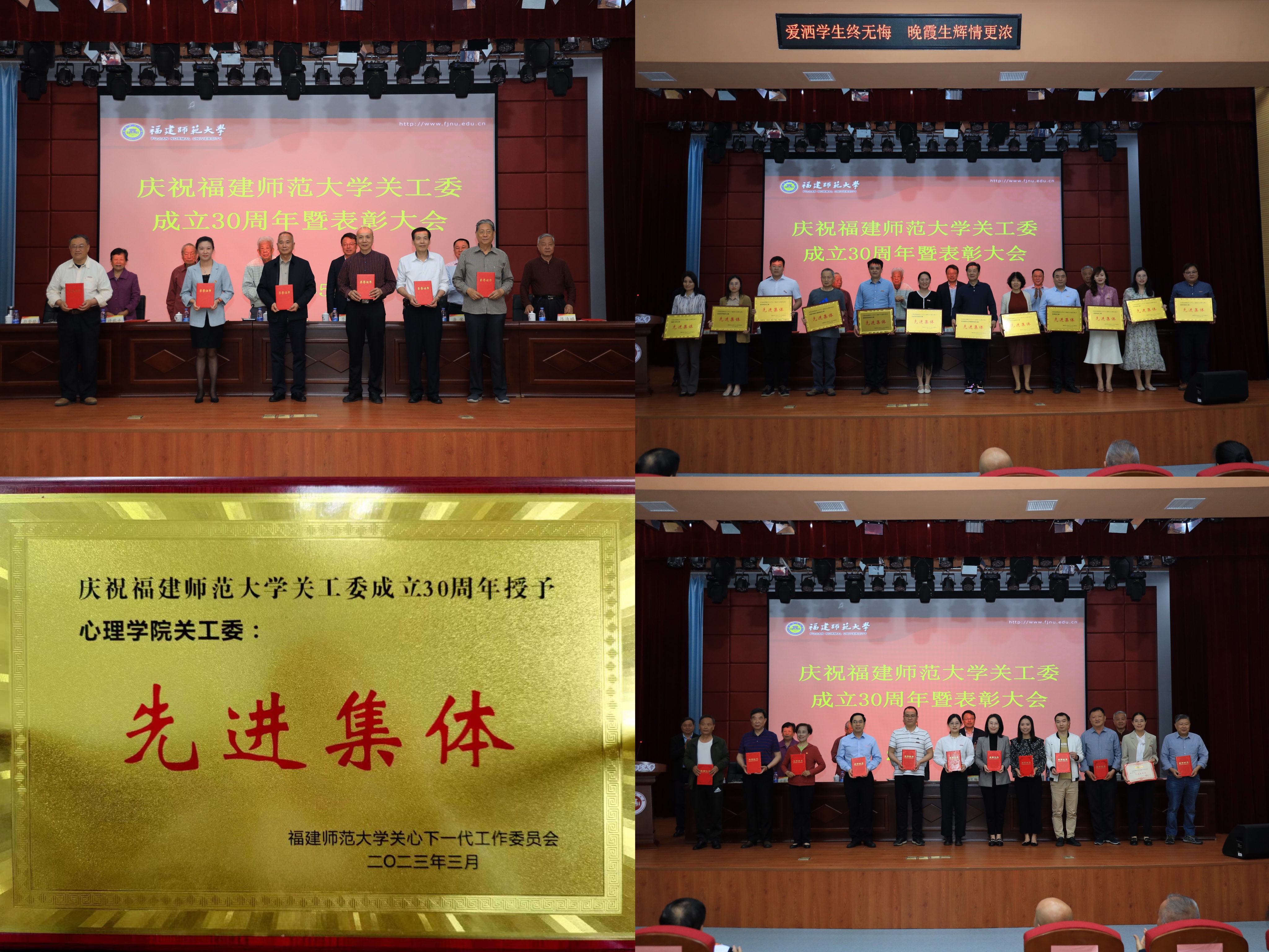 近日,庆祝福建师范大学关工委成立30周年暨表彰大会在仓山校区科学会堂召开。会议通报和表彰我校关工委各类先进集体和先进个人。心理学院程利国、叶建鸣两位老师获评“福建省教育系统关心下一代工作先进工作者”,心理学院关工委获评“校关心下一代先进集体”,陈毓洸(原学院关工委顾问)、程利国、叶建鸣、谢小芬(原学院关工委秘书)四位老师获评“校关心下一代工作先进工作者”。