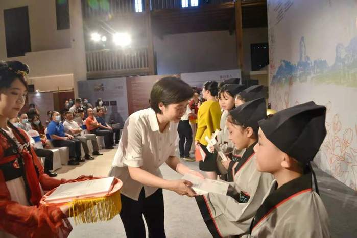 仓山区委常委、宣传部长李亦仁与外国语学院党委书记章琳为仓山区麦浦小学、永泰县嵩口小学等乡村学校的学生代表赠书。仓山区委副书记、代区长刘用全为由我校外国语学院学生组成的烟台山中英文讲解志愿队授旗。讲解志愿队成员吴玉清同学用英文熟练介绍烟台山。随后,仓山区委书记郑子记宣布邀请展开幕。