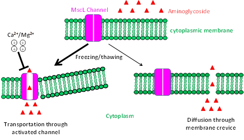细菌耐药是全球面临的重大公共卫生问题,增强传统抗生素的杀菌效率是应对细菌耐药的重要策略。付新苗领导的细菌耐药研究团队,以氨基糖糖苷类抗生素为重点,特别是针对我校王岳教授于1966年发现的庆大霉素(这是中华人民共和国成立以来少数几个标志性的医药成果之一),发展了多种增效减毒的方法。此次报道的快速冰冻方法(液氮,10秒),能将多种氨基糖苷类抗生素的杀菌效率提高百倍到百万倍不等,同时其药物暴露时间降低到一分钟,并在小鼠模型上得到了验证。进一步,作者揭示了该方法的工作机理在于激活了机械敏感离子通道(Mechanosensitive Ion Channel),后者能有效摄取抗生素分子,如下图所示。