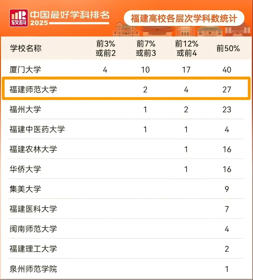 10月15日,上海软科正式发布“2025软科中国最好学科排名”。我校共有27个学科上榜,较上年新增5个,上榜总数位列全国第60位、双非高校第6位、师范类院校第9位,福建省高校第2位、省属高校首位。据悉,该排名榜单包括98个一级学科和5个专业学位类别,各个学科排名的对象是在该学科设有研究生学位授权点的所有高校,发布的是在该学科排名前50%的高校,共有517所高校的5344个学科点上榜。(发展规划处)