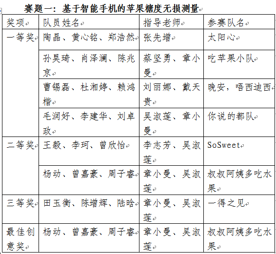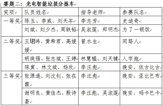近日,第九届全国大学生光电设计竞赛东南区赛在集美大学落幕。我校光电与信息工程学院共有14支队伍参赛,经过两天激烈角逐,取得一等奖6项、二等奖5项、三等奖3项、最佳创意奖1项的好成绩,我校获得单位最佳组织奖。本届大赛由中国光学学会、教育部高等学校光电信息科学与工程专业教学指导分委员会主办。赛题分为“基于智能手机的苹果糖度无损测量”和“光电智能垃圾分拣车”。获奖名单如下: (光电与信息工程学院)