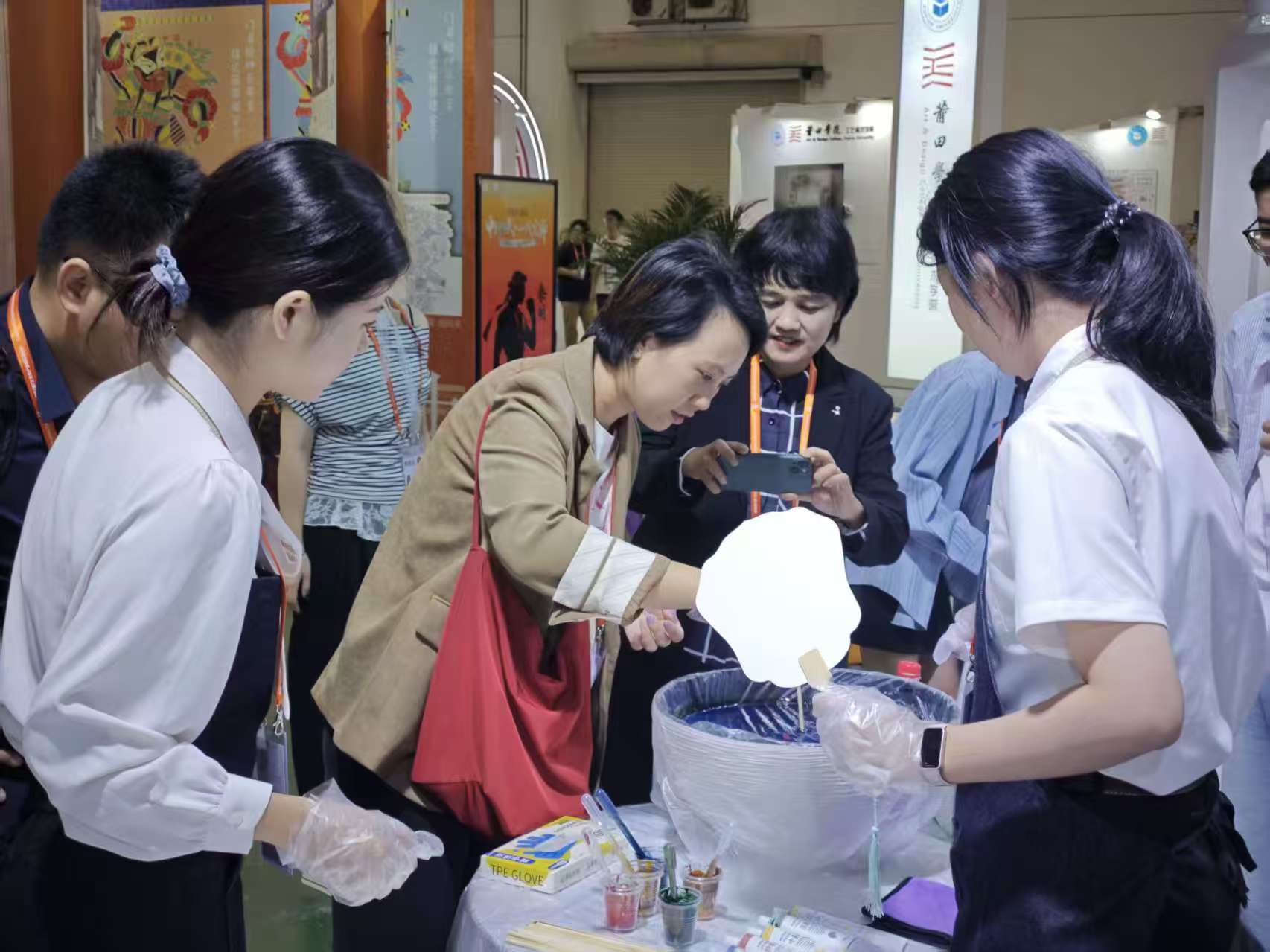 我校独立展区以“艺术与科技赋能生活”为主题,突出“创新、生长、共融”,探索艺术表达的新路径、新形式和新内容,展出了环境艺术设计、视觉传达艺术设计、服装与服饰设计、动画、综合材料绘画等5个专业22件优秀设计作品。展区内还开展漂漆漆扇制作活动、展出“师出邮名”系列创意文创产品、播放原创优秀动画视频,吸引大量参观者驻足欣赏、互动体验。