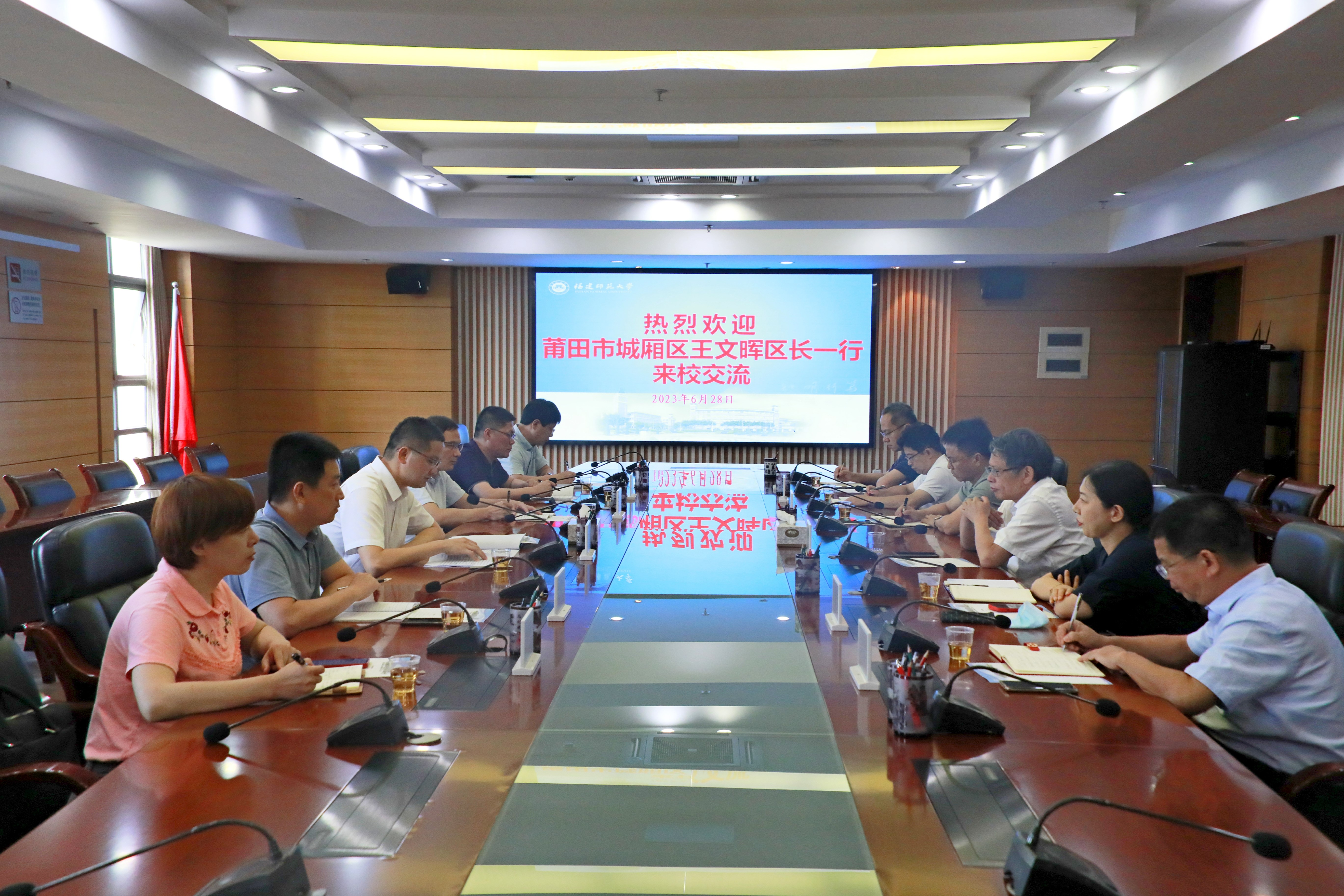 6月28日,莆田市城厢区区委副书记、区长王文晖一行来我校调研交流。副校长陈庆华,党政办公室、科学技术处、产教融合发展中心、教师教育学院和环境与资源学院、碳中和现代产业学院负责人参加调研座谈。座谈会上,双方围绕建立对接协同机制、推动科研成果转化、赋能提速产业发展、强化人才交流培训等校地合作方面进行了深入交流,表示将进一步拓展合作领域,深化务实合作,着力推动双方合作取得新成果、迈上新台阶,实现互利共赢发展。(党政办公室)