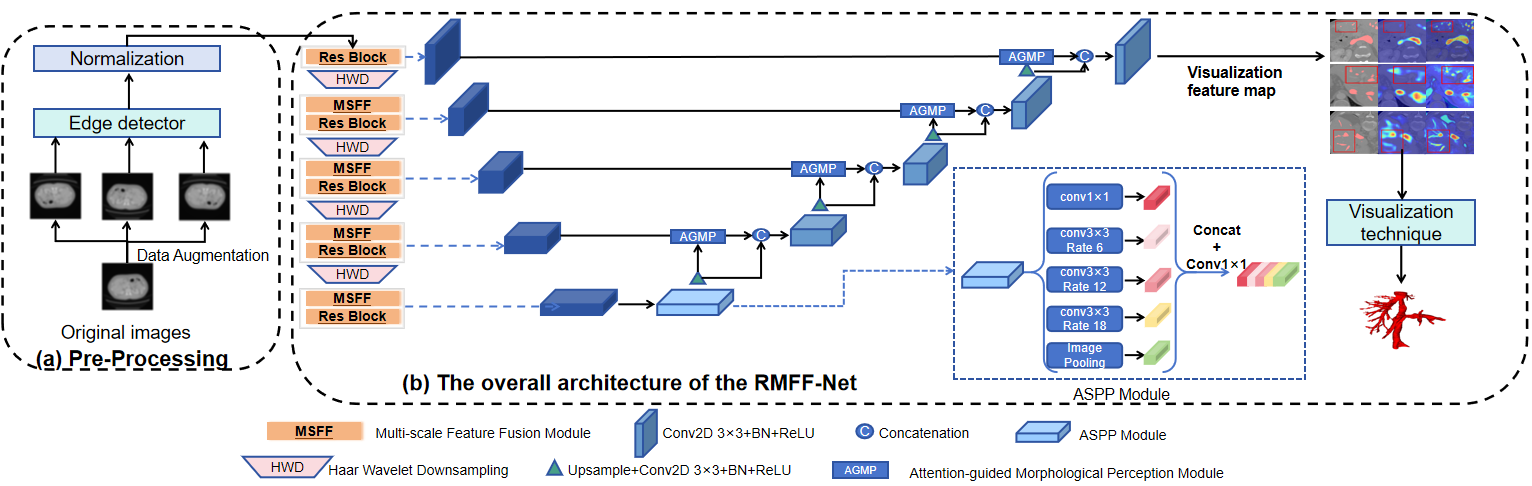 肝脏血管精准分割是肝脏手术规划、肝移植等临床诊疗的关键前提,对降低手术风险、提升治疗效果至关重要。近日,我校计算机与网络空间安全学院时鹏博士研究团队与福建肿瘤医院钟婧博士团队合作,在肝脏血管分割领域取得重要突破,提出残差启发的多尺度特征融合网络(RMFF-Net),为临床精准诊疗提供了新的技术支撑。该研究成果在公共数据集上表现优异:在3Dircadb数据集动脉分割DSC达0.849、静脉DSC达0.846,MSD数据集整体DSC达0.726,且网络参数仅15.38M,在保证高精度的同时兼顾了计算效率。这一技术创新有效解决了肝脏血管结构复杂、分布稀疏、与周围组织对比度低等分割难题。