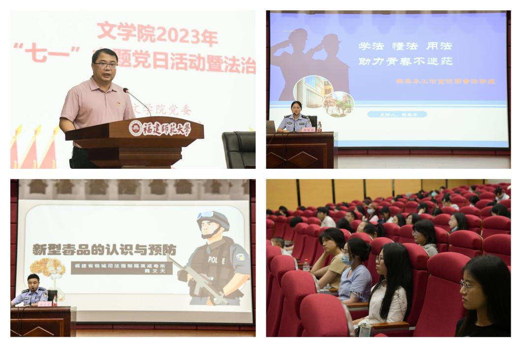 6月30日下午,文学院在科学会堂举办“七一”主题党日活动暨法治教育讲座。活动邀请到福建省女子监狱四级高级警长陈黎华、一级警长曾晟、一级警员林善瑶,福建省榕城司法强制隔离戒毒所副所长胡波、大队长杨维晖、公职律师薛繁云,教育科谢梅琴、魏文天、罗涛义警官来校交流、指导。活动由学院党委副书记(主持工作)叶祖淼主持,文学院师生近200人共同参加。