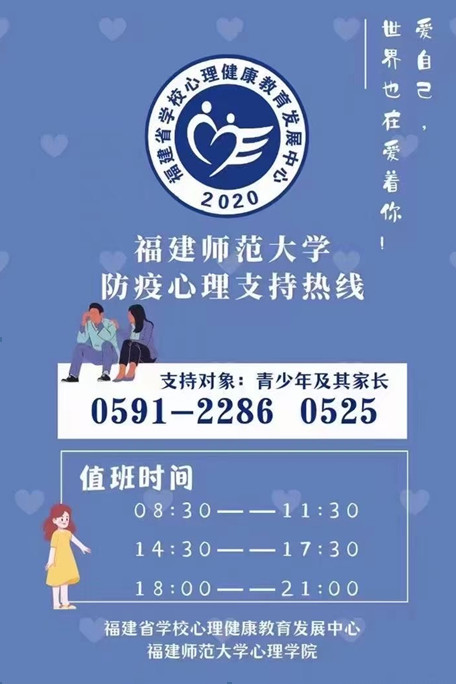 我省疫情发生后,我校心理学院与福建省学校心理健康教育发展中心与迅速响应号召,组建了一支由心理学院师生组成的专业心理防疫突击队,开通福建师范大学防疫心理支持热线22860525,为全省及疫情高发地区的青少年学生和家长提供心理支持和情绪疏导。心理防疫突击队还与省妇联、团省委、仙游县联动,承接省妇联热线12338的接线咨询工作,为共青团12355服务台、仙游县心理援助热线提供专业队伍支持。突击队将根据疫情发展情况开展防疫心理知识普及、心理健康调研、心理援助等工作。(心理学院)