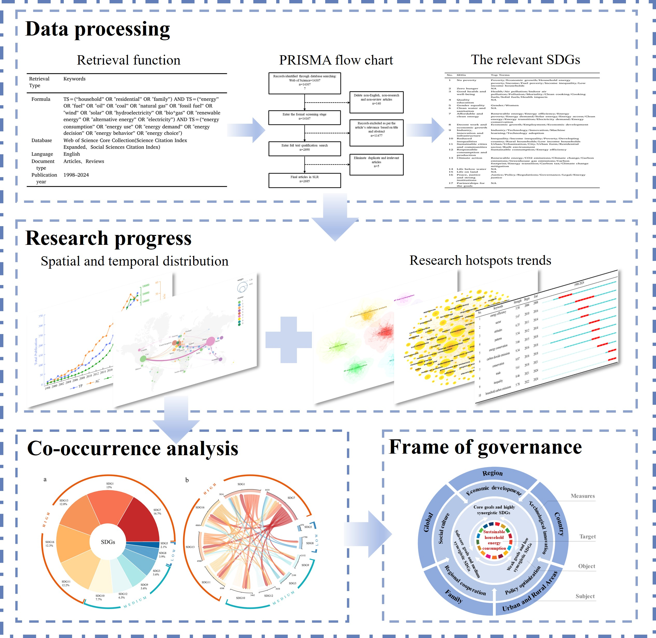 (二)揭示了家庭能源消费与SDG目标间的关联路径。家庭能源消费作为联结微观生活需求与宏观经济、社会和环境系统的关键节点,当前研究却普遍缺乏对其与整个可持续发展目标之间复杂关系的系统性综述与深入解析。研究构建 “数据筛选—趋势解析—机制挖掘”的全链条研究方法体系,系统绘制了家庭能源消费与SDGs的关联网络。发现全球家庭能源消费研究快速发展,但呈现显著的地域失衡特点,制约了全球治理方案的形成;随着可持续发展水平的提升,研究热点已从早期单一议题逐步转向社会环境协同治理主题;通过共现网络分析得出,SDG1、SDG7、SDG11、SDG13、SDG16构成高协同研究核心,而SDG5、SDG8的协同效应尚未充分激发。研究揭示了家庭能源消费与SDGs的非线性关联,有力的支持了以能源系统为中心的可持续发展目标从分散实施向系统协作的转变。