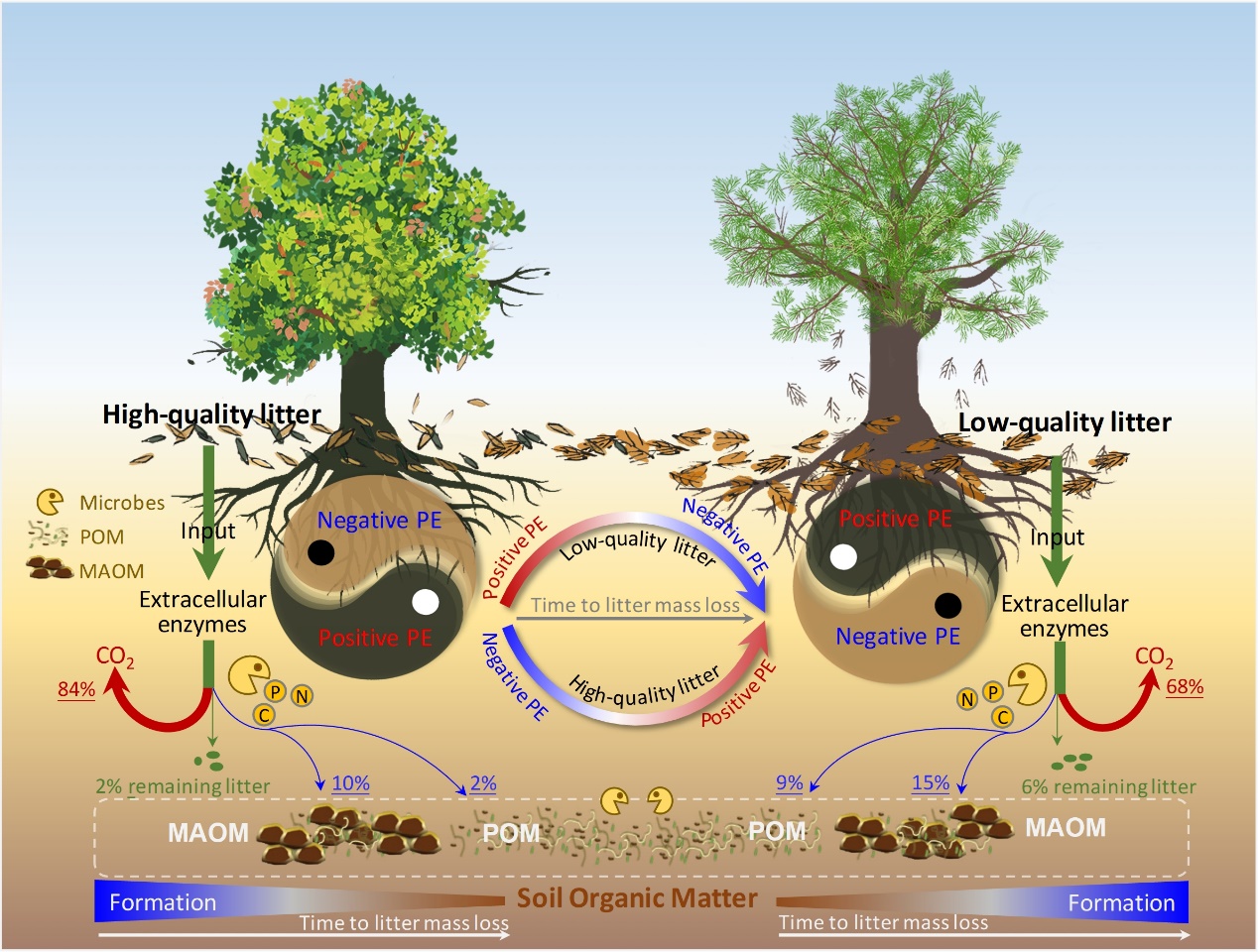 近日,我校福建三明森林生态系统国家野外科学观测研究站研究人员在野外条件下,采用13C同位素示踪技术研究了不同质量凋落物对土壤激发效应的影响,追踪了凋落物源碳在土壤颗粒态有机质(POM)和矿物结合态有机质(MAOM)的分配,揭示了高多样性森林中不同质量凋落物驱动土壤有机碳分解与形成的互补效应(图1)。相关研究成果以“Litter quality controls tradeoffs in soil carbon decomposition and replenishment in a subtropical forest”为题,发表在国际著名生态学期刊Journal of Ecology上。吕茂奎副研究员为第一作者,谢锦升教授和陈光水教授为共同通讯作者,福建师范大学为第一署名单位。该研究得到了国家自然科学基金重点项目和面上项目的资助。