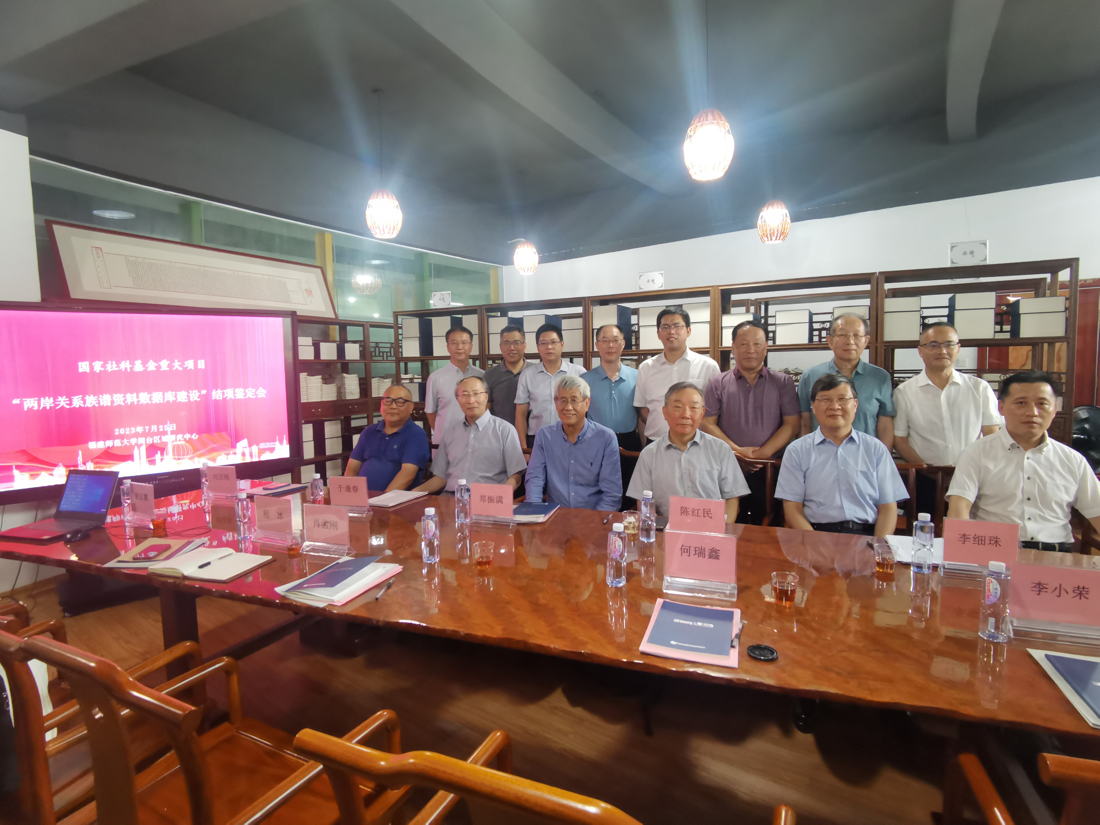 7月25日,由我校闽台区域研究中心谢必震教授任首席专家的国家社科基金重大项目“两岸关系族谱资料数据库建设”(批准号:17ZDA214)结项鉴定会在两岸信息技术有限公司举行。经全国社科工作办批准,厦门大学郑振满教授、浙江大学陈红民教授、浙江师范大学于逢春教授、暨南大学刘正刚教授、中国社科院近代史所李细珠研究员、上海大学严泉教授作为专家组参加鉴定验收。福建省社科联社科规划办主任肖孟刚、我校人文社科平台管理中心副主任何瑞鑫、闽台区域研究中心主任李小荣、项目首席专家谢必震教授及子课题组成员参加会议。鉴定会由肖孟刚主持。