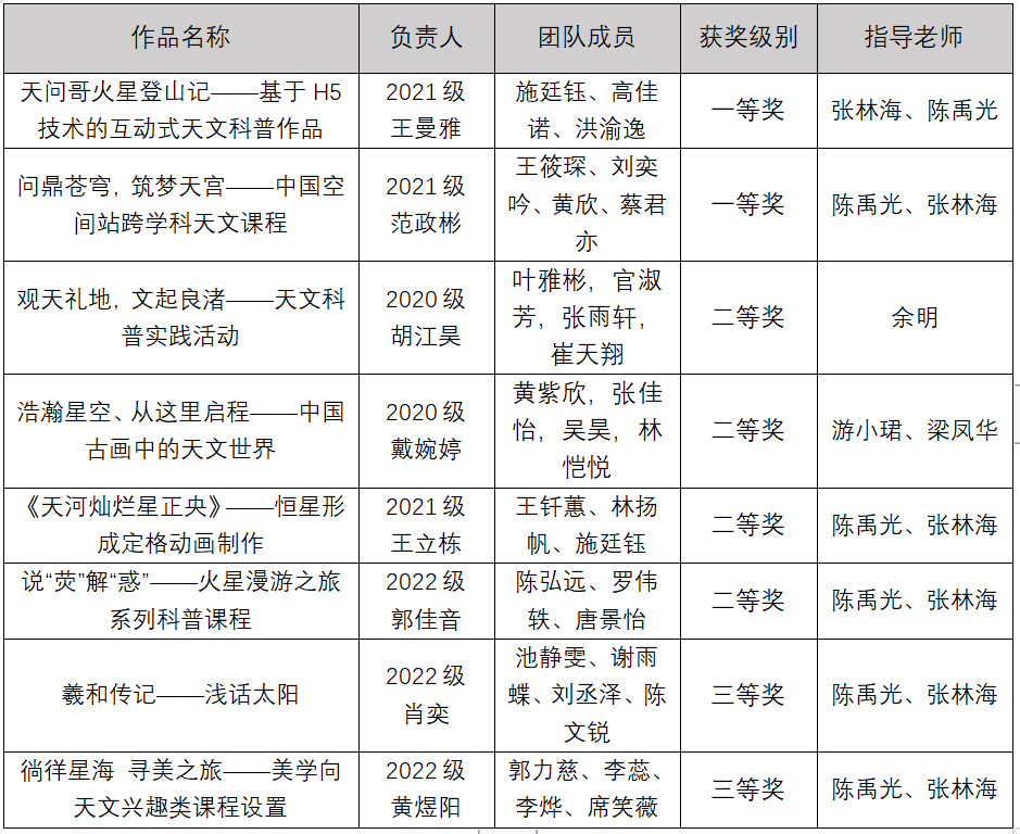 近日,由中国天文学会主办的第六届全国大学生天文创新作品竞赛在中国科学院国家天文台闭幕。大赛共征集到来自45所高校的有效参赛作品141项,52项作品进入决赛。在决赛中,我校地理科学学院、碳中和未来技术学院共获一等奖2项,二等奖4项,三等奖2项,优秀奖5项,最佳人气奖1项,指导教师为余明、张林海、游小珺、梁凤华以及闽江师范高等专科学校陈禹光老师。同时,我校获得“优秀组织单位”称号,创造了我校参加该比赛的最好成绩。(地理科学学院、碳中和未来技术学院)