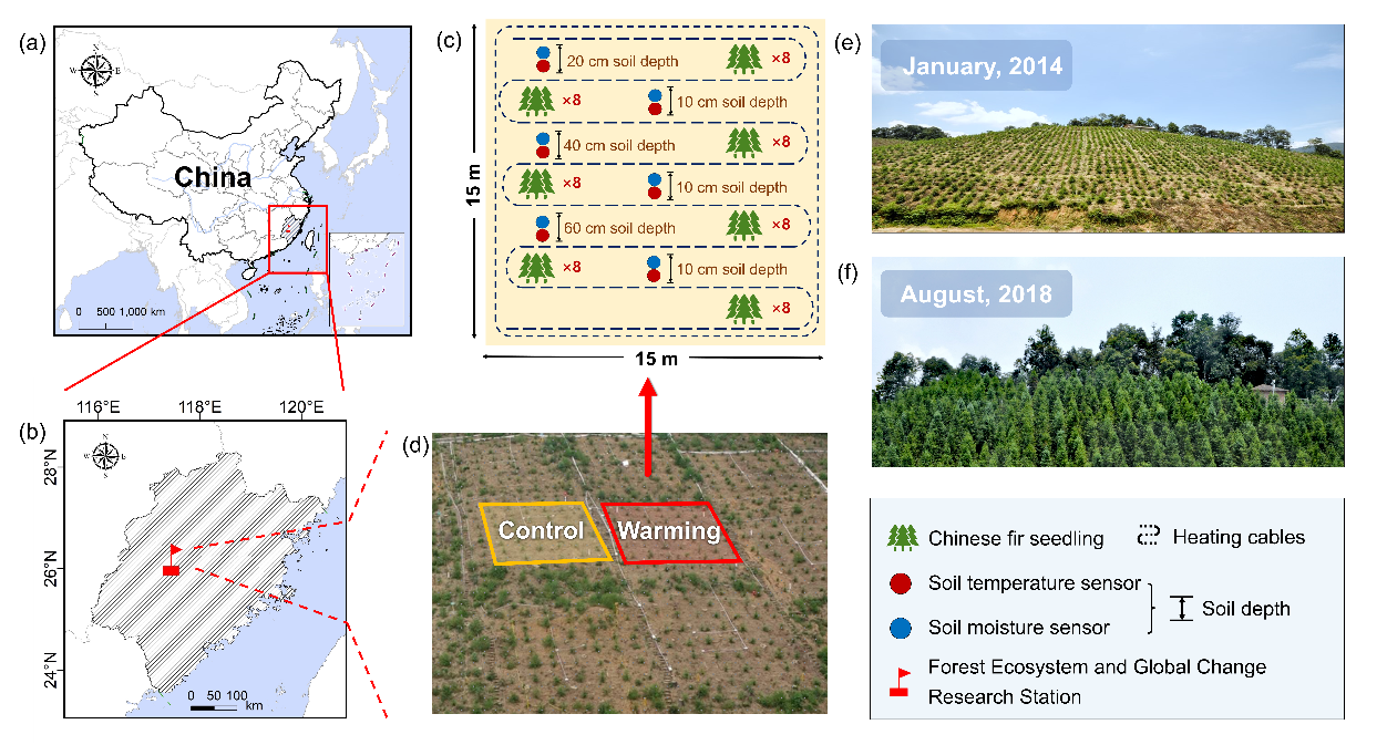 气候变暖深刻影响陆地生态系统碳循环过程。人工林作为应对气候变化的重要举措,其碳汇能力对未来气候变暖的响应备受关注。然而,当前有关气候变暖对人工林土壤有机碳的影响仍缺乏相关研究,尤其是深层土壤有机碳组分对气候变暖的响应模式及其调控机制更是鲜有报道。