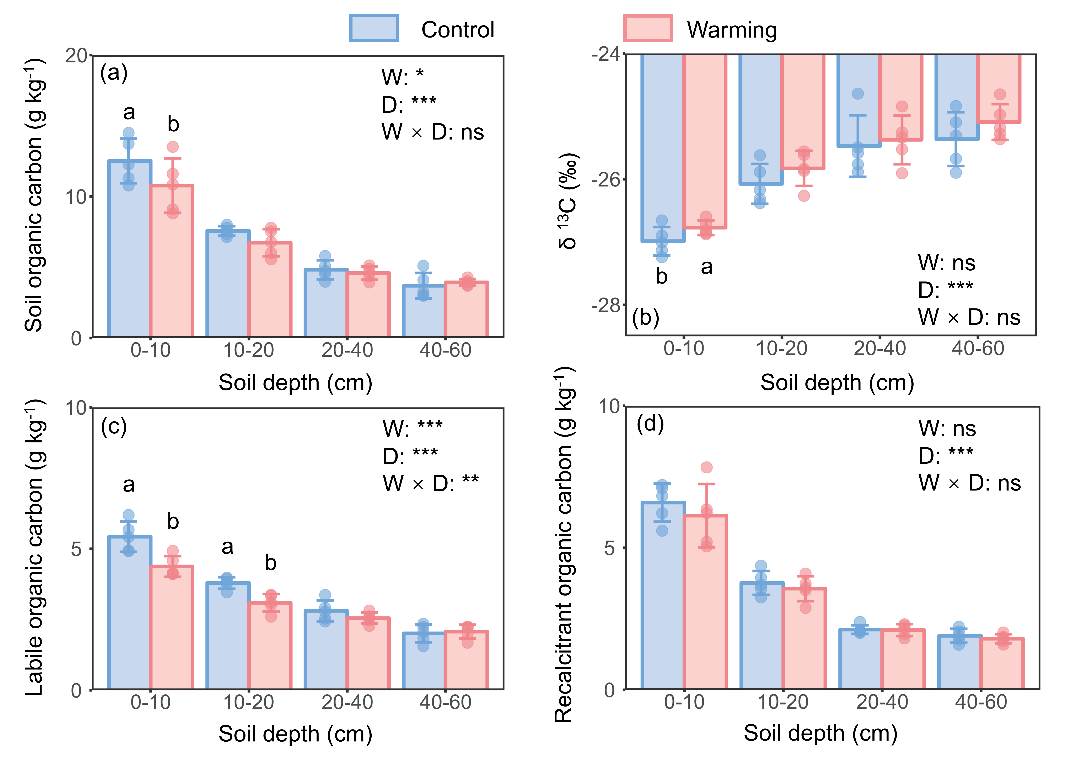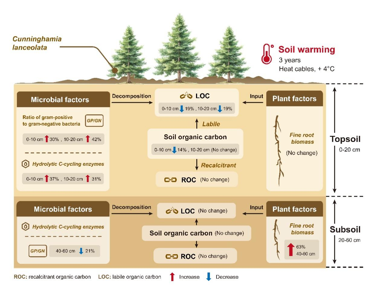 针对上述科学问题,研究人员依托福建三明森林生态系统国家野外科学观测研究站2014年建立的杉木(Cunninghamia lanceolata)人工林土壤增温实验平台。在增温后第三年,通过分析不同土层(0-60 cm)土壤易分解有机碳和难分解有机碳等组分,并结合微生物群落结构、碳循环相关胞外酶活性以及细根生物量等指标,系统评估了气候变暖背景下不同土层土壤碳组分的响应特征及其驱动机制。研究发现,增温显著降低了表层土壤(0-20 cm)易分解有机碳含量(降幅约为 19%),但深层土壤(20-60 cm)中易分解与难分解有机碳含量在增温后均未有显著改变。且表层与深层土壤有机碳对增温的响应机制不同:增温通过促进碳水解酶活性,调整微生物群落结构向寡营养型方向的转变促进表层土壤易分解有机碳的分解;在深层土壤中,增温通过增加细根碳输入维持土壤有机碳的稳定。此外,增温后表层与深层土壤难分解有机碳含量均未发生显著改变,挑战了难分解碳具有更高的温度敏感性的传统认知。研究结果为改进亚热带森林碳循环模型、评估气候变暖对土壤碳库稳定性的影响提供了关键的科学依据。