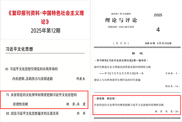 近日,《理论与评论》2025年第4期刊发的《从坚持党的文化领导权维度把握习近平文化思想的原理性贡献》一文,被《人大复印报刊资料•中国特色社会主义理论》(2025年第12期)全文转载,彰显了《理论与评论》在相关领域的学术公信力与理论影响力。(马克思主义学院)