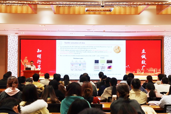 报告会上,黄永刚院士以深厚的学术积淀和前沿的科研视野,从远程触觉感知的应用场景切入,剖析了当前压力触觉驱动器存在的技术短板,聚焦多模态触觉执行器的理论前沿,阐述了该项研究的创新性力学模型和远程精准触觉联动机制,介绍了该项研究在虚拟现实交互和智能穿戴设备等领域的广阔应用前景。在互动环节,黄院士耐心细致解答了师生们的问题,并结合自身成长经历鼓励广大师生潜心钻研学术、深耕基础研究。