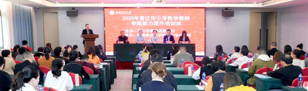 12月9日,由晋江市教育局、晋江市教师进修学校主办,我校数学与统计学院承办的2025年晋江市小学数学教师命题能力提升培训班在福州举行。数学与统计学院党委书记程惠斌、副书记王尚鹏,主办单位相关负责人,晋江市各小学100名数学教师参加了开班式。开班式由王尚鹏主持。