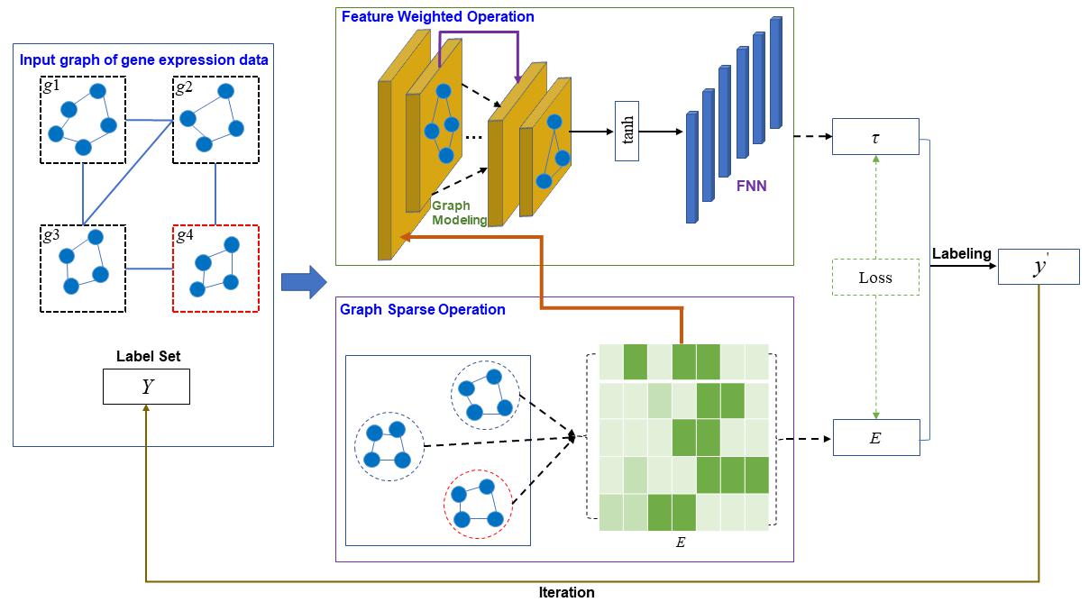 基因表达数据可以用于分析表达变化的基因、基因之间的相关性以及不同环境对基因活动的影响。然而,标记大量的基因表达数据既费力又耗时。标记数据不足对构建深度学习模型提出了挑战。我们提出了一种新的半监督图神经网络模型(SFWN: Semi-Supervised Feature Weighted Neural Network)。首次利用基因表达数据的外部知识构建了特征图、相似性核和样本图,同时提出了一种新的半监督学习算法(SGA)来提取数据关系,更好地获得全局样本结构,还提出了一种图稀疏模块(SGCN)来处理基因表达数据分类的稀疏表示。为了克服过平滑问题,提出了一种新的基于双空间特征计算方法来分析和计算该模型中的特征表示。所提出的SFWN模型具有较强的基因表达特征学习和表征能力,可能为相关疾病的诊断和临床实践提供新的见解和工具。