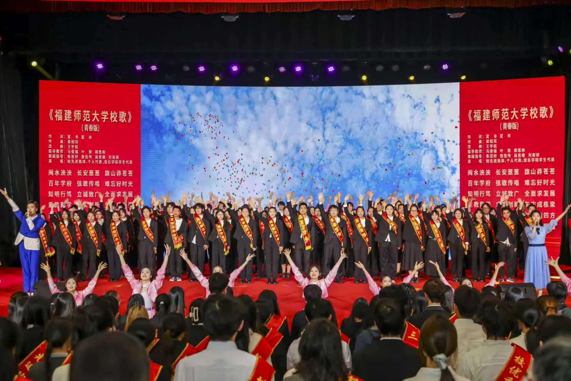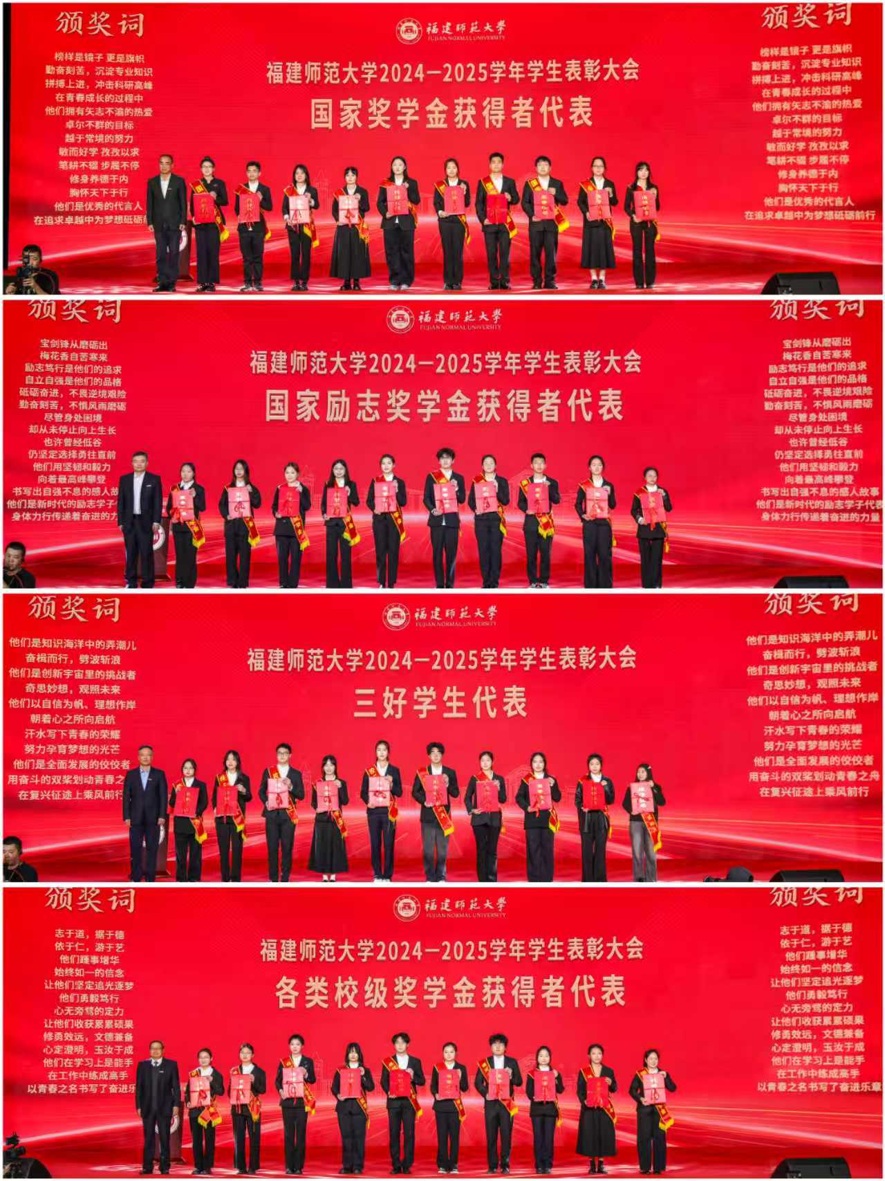 会上,校党委副书记吴剑锋宣读表彰名单,出席会议的领导为受表彰学生代表颁发荣誉证书,4位学生代表依次发表获奖感言。现场播放了反映我校学生工作成果的视频《聚力“一心五环” 引领青春航向》,先进集体与先进个人代表共同朗诵原创诗歌《青春的模样》,与会师生合唱《福建师范大学校歌》。