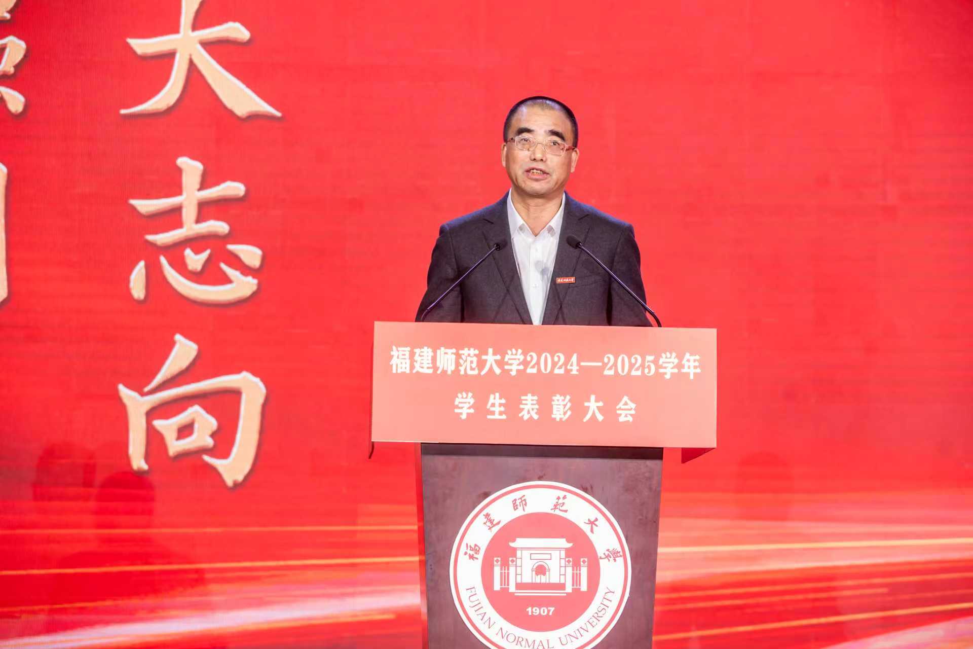 大会在雄壮的国歌声中拉开帷幕。校长郑家建代表学校向受到表彰的先进集体和先进个人表示热烈祝贺,向辛勤培育学生的全体教职工致以诚挚感谢。他充分肯定了一年来我校青年学生在各方面取得的优异成绩,鼓励同学们以先进集体和个人为榜样,奋发拼搏、励志耕耘。同时,他围绕学生成长与发展,向全体学生提出四点希望:一要在坚定信念中锚定青春坐标,将个人理想嵌入民族复兴的历史经纬,勇闯科技前沿,扎根基层大地,传承文化星火,以个人的微光汇聚成中国式现代化的闪亮星河;二要在实践担当中淬炼过硬本领,勇于走出课堂的舒适区,投身创新攻关的最前沿、乡村振兴的第一线、社会服务的大舞台;三要在艰苦磨砺中积蓄成长力量,敢于自动选择“自找苦吃”,不囿于“小确幸”,不纠结“性价比”,在求真求知上下足“笨功夫”,在实践实干中坚持“苦功夫”;四要在笃行实干中书写华彩青春,不做夸夸其谈的“客里空”,要做起而行之的“行动者”,把远大目标落细为日常步履,成就自己丰沛充盈的人生。他强调,广大教职工要坚守育人初心,以教育家精神为引领,当好学生成长路上的引路人和同行者;全体学生要见贤思齐、勇毅前行,以福建师大青年学子自信之姿,在强国建设、民族复兴的伟大征程中贡献青春力量。