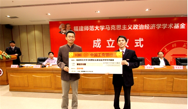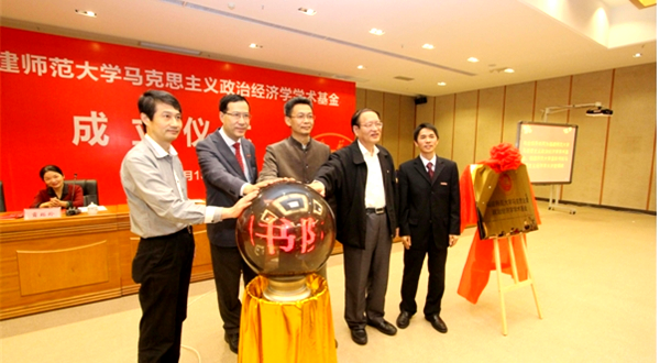 5月18日,为及时贯彻落实中央哲学社会科学工作座谈会精神,开拓我校马克思主义政治经济学发展新境界,由我校经济学院91级校友、福建蓝田书院理事长余云辉博士捐资100万元人民币成立的“福建师范大学马克思主义政治经济学学术基金”在我校正式启动成立。出席成立仪式的有我校校友、福建蓝田书院理事长余云辉博士,福建省社科联副主席陈文章,我校校长王长平、原校长李建平,学校办公室、宣传部、社科处、财务处、校友总会负责人,经济学院师生代表,以及新华社、中新社、东南网、《中国教育报》、《中国经济导报》、《福建日报》、《海峡都市报》、福建电视台新闻中心、福建电视台经济频道、福建教育电视台等新闻单位的记者。