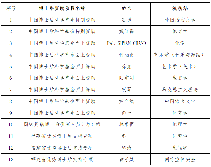 近日,中国博士后科学基金会公布了第78批中国博士后科学基金面上资助人员名单,我校获资助4项。2025年,我校累计获中国博士后科学基金特别资助2项、面上资助7项,国家资助博士后研究人员计划(C档)1项,福建省优秀博士后支持专项3项;入选国家级博士后引进专项建议人选2人。此外,在站博士后共获国家自然科学基金青年科学基金3项、国家自然科学基金外国学者研究基金项目1项,国家社会科学基金一般项目2项。 (人事处、高层次人才工作办公室)