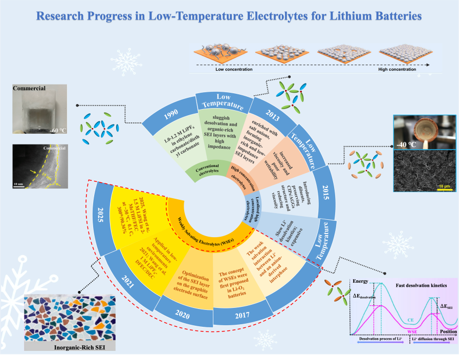 锂电池(Lithium-Based Batteries, LBBs)在低温环境下面临离子传输迟缓、界面阻抗显著增加以及固体电解质界面(SEI)结构不稳定等一系列关键挑战,进而引发容量快速衰减、充放电效率降低,甚至带来潜在安全隐患,严重制约了其在寒冷地区、高空平台及极端工况下的实际应用。弱溶剂化电解液(WSEs)凭借其独特的阴离子主导溶剂化结构,成为提升LBBs低温性能的有效解决方案,近年来受到广泛关注。