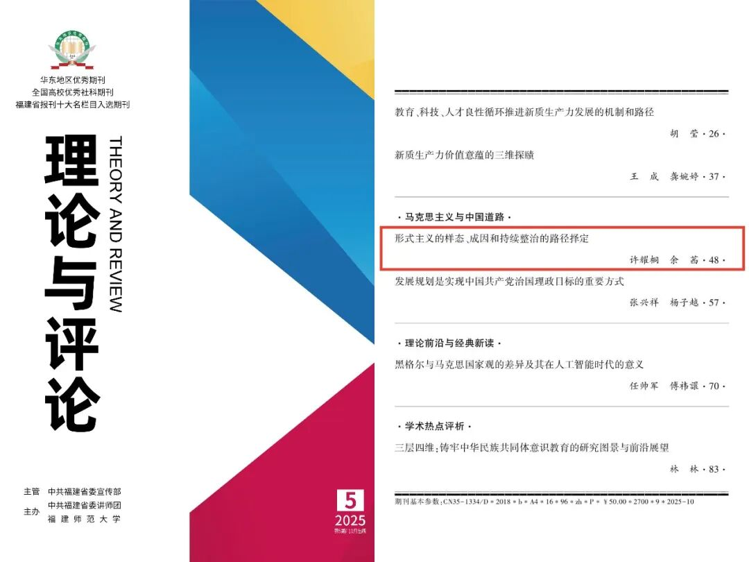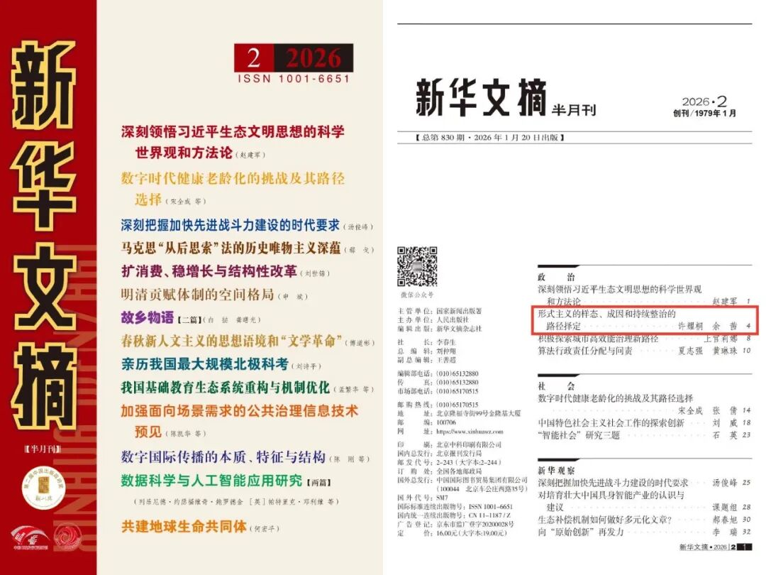 近日,《理论与评论》2025年第5期刊发的《形式主义的样态、成因和持续整治的路径择定》一文被《新华文摘》(2026年第2期)全文转载。此前,该文还被人大复印报刊资料(《中国共产党》2026年第1期)全文转载。该文作者系我校马克思主义学院特聘教授、中共中央党校(国家行政学院)一级教授许耀桐,中共北京市委党校(北京行政学院)副研究员余茜。(马克思主义学院)