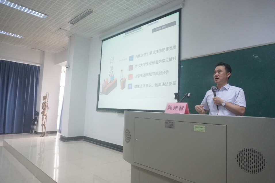 讲座中,陈建智围绕“大学生常见的十种违法犯罪行为类型”“大学生受侵害的常见情形”“大学生违法犯罪行为的特点”“大学生违法犯罪原因分析”“大学生如何提高法律意识”等方面,通过近60个生动鲜活、发人深省的现实案例,以案释法,以法论事,教育引导同学们树立法治观念、增强法律意识,养成遵纪守法的好习惯。