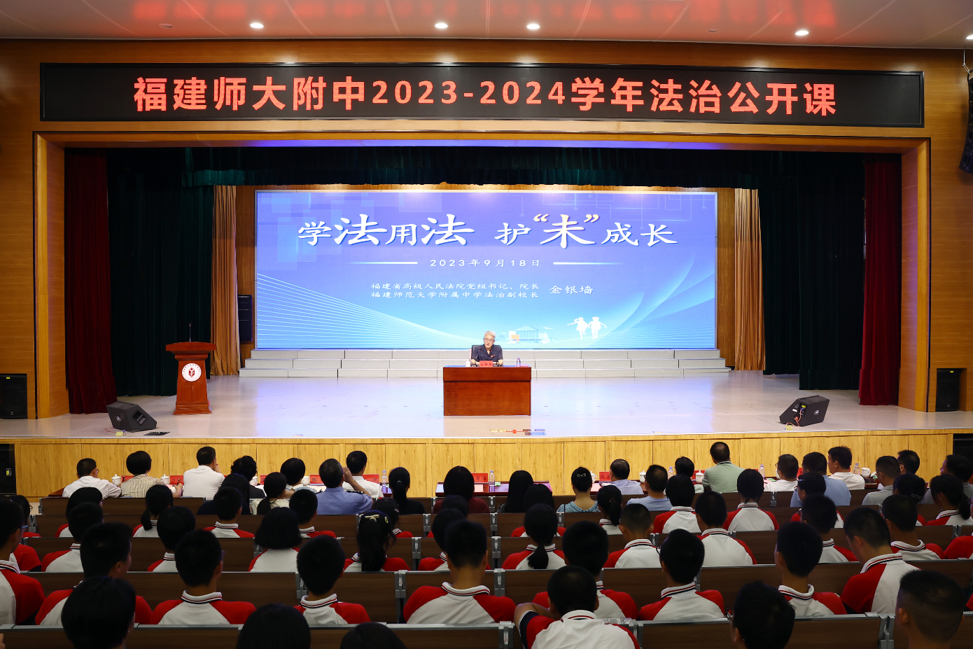 仪式上,福建高院党组书记、院长金银墙向学生代表赠送法治书籍,并以“学法用法 护‘未’成长”为题,从“法律是什么、法治又是什么”“未成年人的权利和义务”“构建家庭、学校、社会、网络、政府、司法‘六大保护’体系” 3个方面为师生和家长们讲授法治公开课。他表示,在实现强国梦的征程上,法治是重要保障、是安邦固本的基石,国家的长治久安、人民的幸福生活都离不开法治的作用。他希望同学们牢记“以天下为己任”的校训,关注法治、了解法治、参与法治,自觉尊法学法守法用法,做社会主义法治的崇尚者、遵守者、捍卫者。