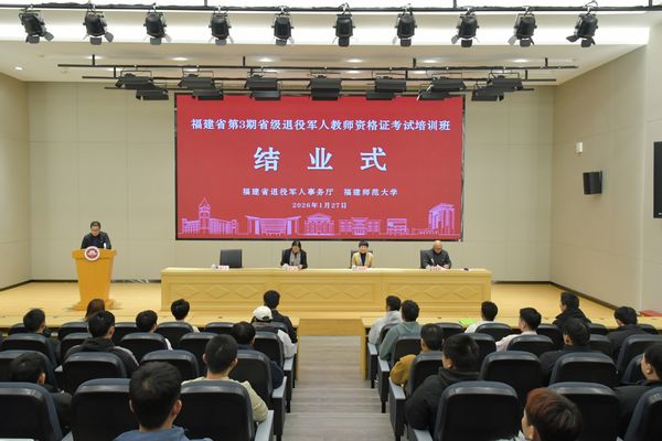 1月27日下午,福建省第3期省级退役军人教师资格证考试培训班结业仪式在我校仓山校区举行。福建省退役军人关爱基金会理事长郑敏、福建省退役军人事务厅移交安置和就业创业处处长林玉琴,我校培训学院负责人及全体学员等参加结业仪式。仪式由培训学院副院长郑磊主持。